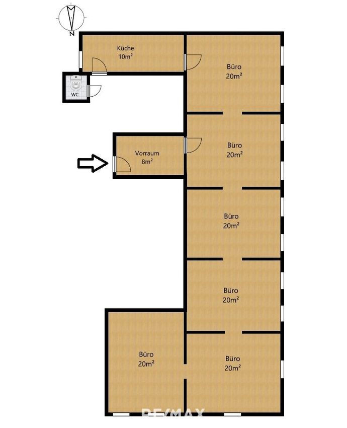 Insgesamt stehen sechs nahezu gleich große Zimmer mit jeweils rund 20 m² zur Verfügung. Diese Raumaufteilung bietet vielfältige Nutzungsmöglichkeiten – von Einzel- oder Gemeinschaftsbüros über Besprechungsräume bis hin zu Behandlungs- oder Therapieräumen. Die gleichmäßige Zimmergröße erleichtert eine strukturierte Organisation und schafft faire Flächenverhältnisse innerhalb eines Teams.