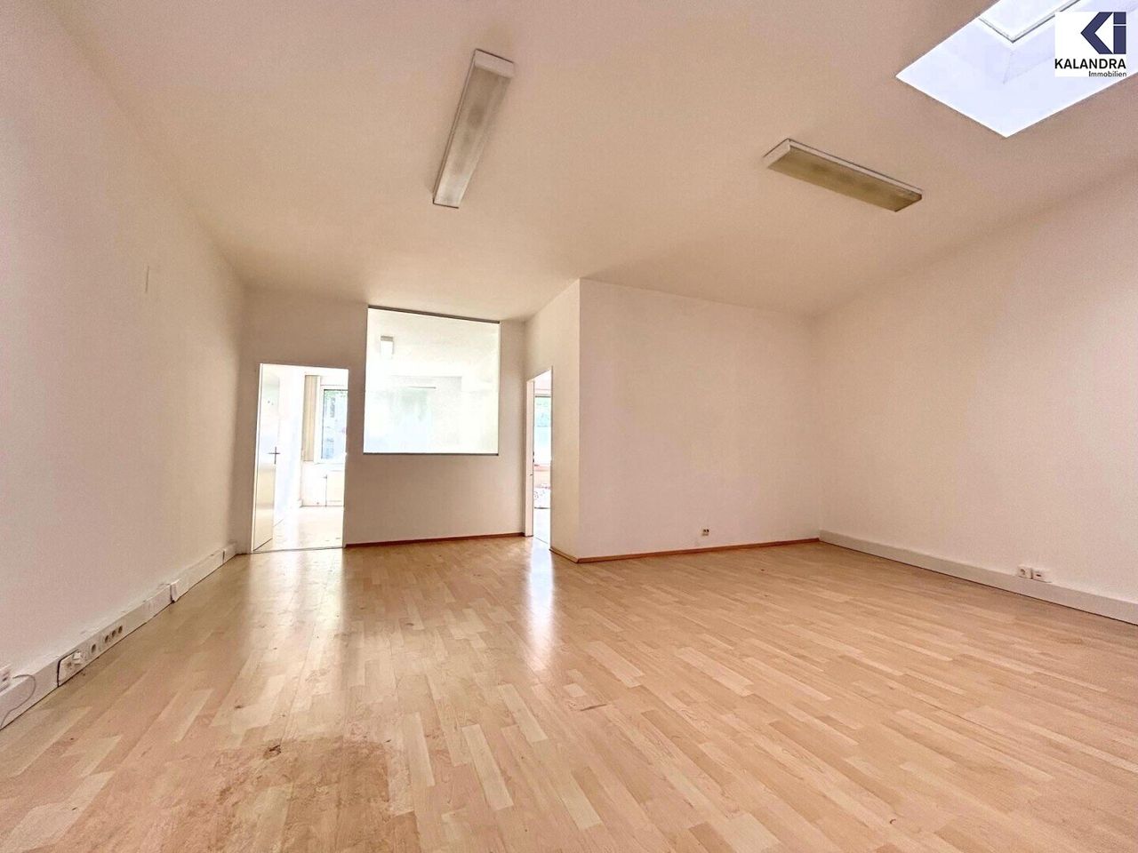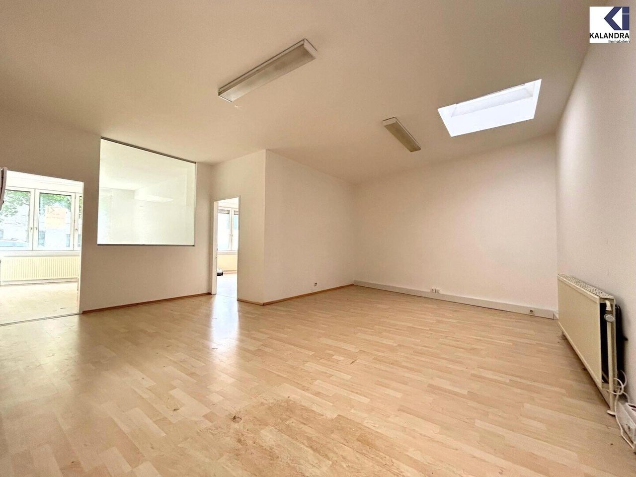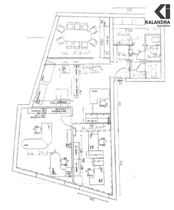Eingang über das Stiegenhaus, Empfang/ Wartezimmer, 2 straßenseitige Räume, innenliegender Besprechungs-/ Raum durch 2 Lichtkuppeln tagesbelichtet, Küche mit Eßecke, WC mit Waschtisch, ein Duschbad.