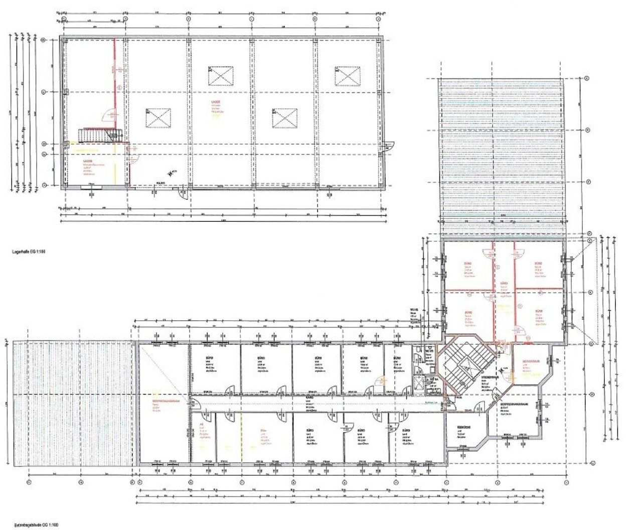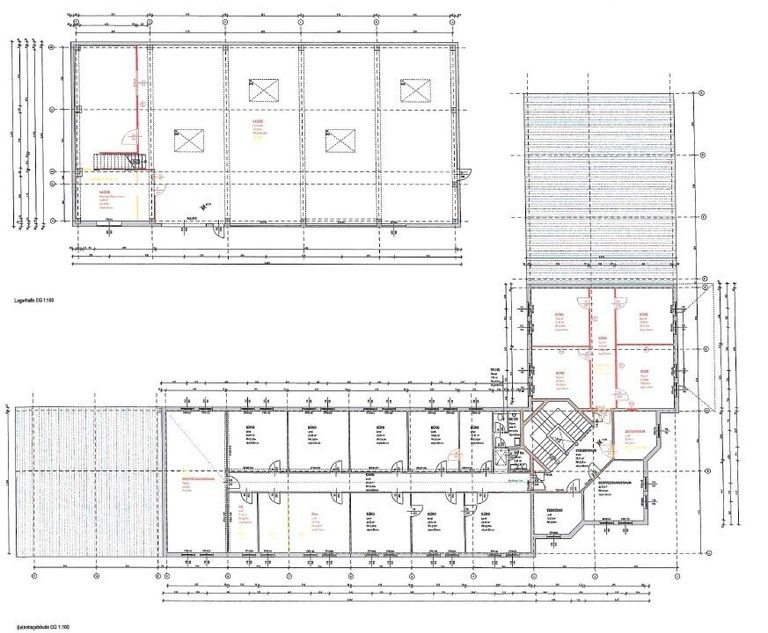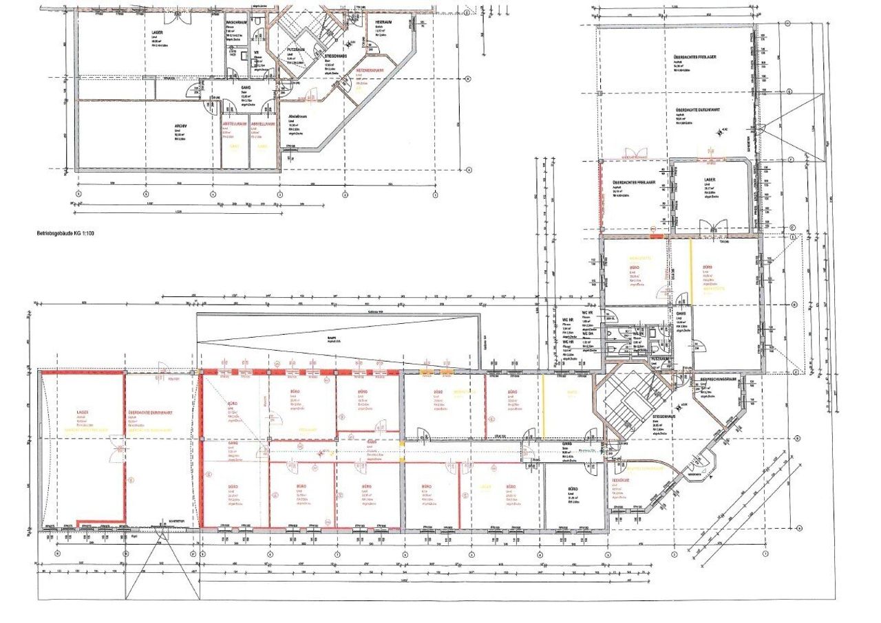 Im Erdgeschoss sind Büroflächen sowie Lagerflächen und die Einfahrt (2 Rolltore) zur Lagerhalle untergebracht. Im Obergeschoß befinden sich ausschließlich Büroflächen.