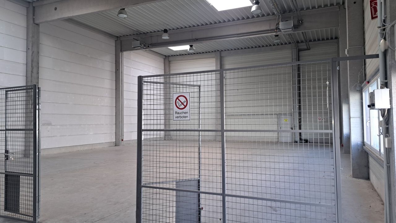 Die Lagerhalle wurde in Skelettbauweise errichtet (ca.8m hoch) und beinhaltet ein Lagerbüro, eine kleine Werkstatt, eine Stahlbühne sowie zusätzliche Lagerflächen.