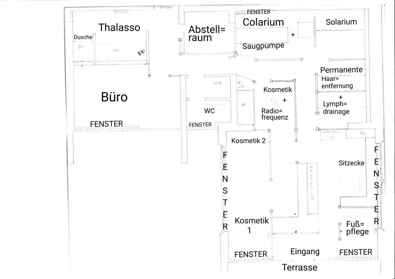 Der im Wohnungseigentum stehende, als Lokal gewidmete Kosmetiksalon liegt mitten in einer großen Wohnhausanlage in Purkersdorf. Der bautechnisch weitgehend offene Raum ist mittels mobiler Trennwände in 7 Kosmetikstationen unterteilt. Diese sind Kosmetik, Kosmetik mit Ultraschall, Microneedling und Radiofrequenz, Fusspflege, Permanente Haarentfernung und Lymphdrainage, Thalassobehandlungen, Colarium (Infrarot) mit Saugpumpe und Solarium (UV), ausgestattet mit allen notwendigen Geräten. Dusche und WC sind vorhanden.