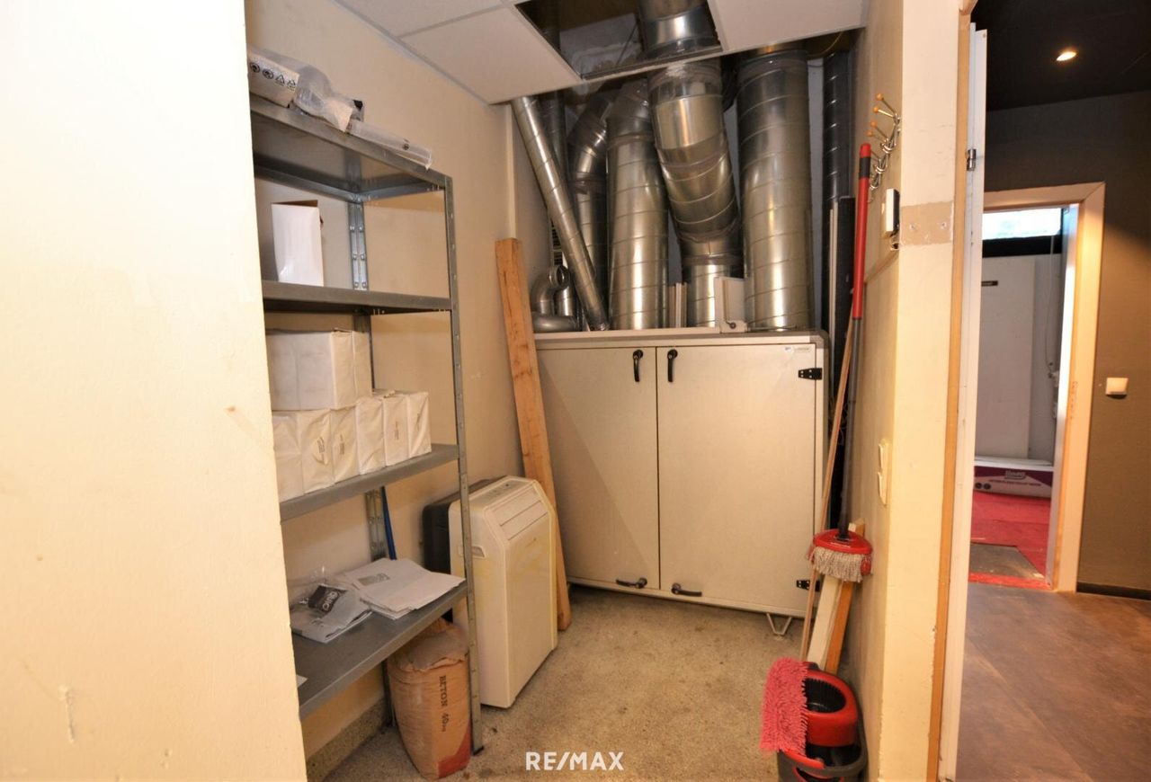 Im vorderen Bereich befinden sich zwei Haupträume, die sich ideal als Empfang, Verkaufsfläche, Schauraum oder Arbeitsbereich eignen. Des Weiteren gibt es noch einen Nebenraum, ein praktisches Lager, ein Abstellraum, eine Teeküche sowie separate Sanitäreinheiten für Damen und Herren – jeweils mit WC, das Herren-WC zusätzlich mit zwei Pissoirs.