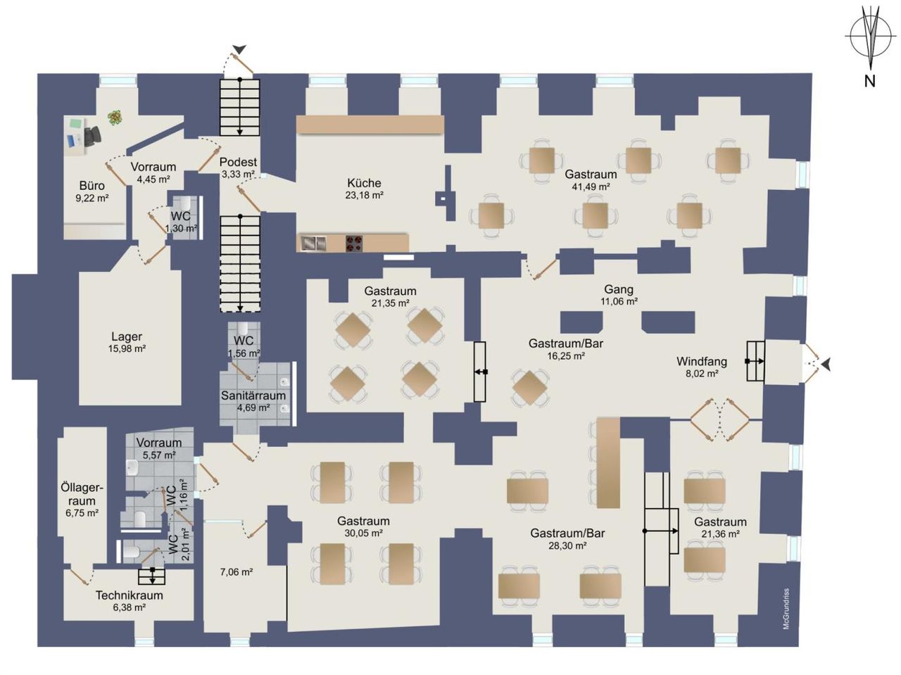 Der durchdachte Grundriss bietet eine Vielzahl an offen gestalteten Räumen mit flexiblen Nutzungsmöglichkeiten. Insgesamt stehen sechs großzügige Haupträume zur Verfügung, mit ca. 41,49 m², 30,05 m², 21,35 m², 21,36 m², 28,30 m² und 16,25 m², die sich ideal für unterschiedliche gewerbliche Konzepte eignen.