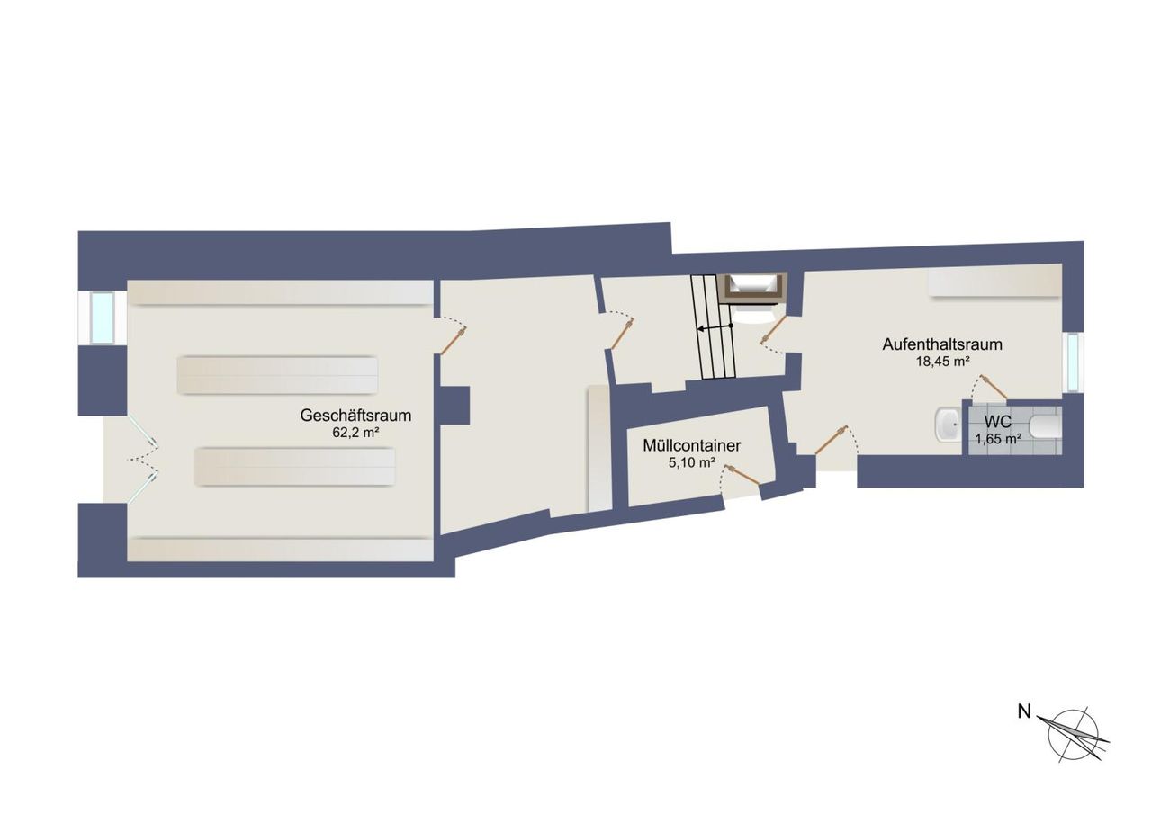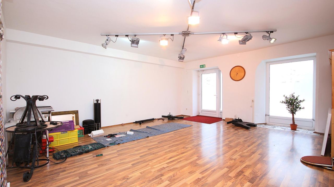 Der großzügige, helle Geschäftsraum bildet den zentralen Ausgangspunkt und führt in einen weiteren Raum, der sich flexibel als nutzen lässt. In weiterer Folge gelangt man in ein separates Büro. Ein WC rundet das Raumangebot ab.