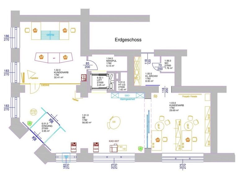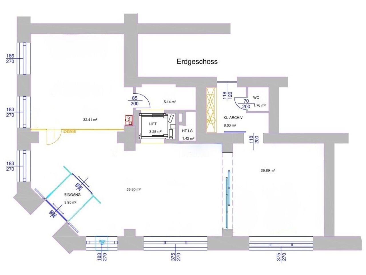 - EG: 2 großzügige Geschäftsräume, 1 Abstell/Serverraum, 1 Küche, 1 WC