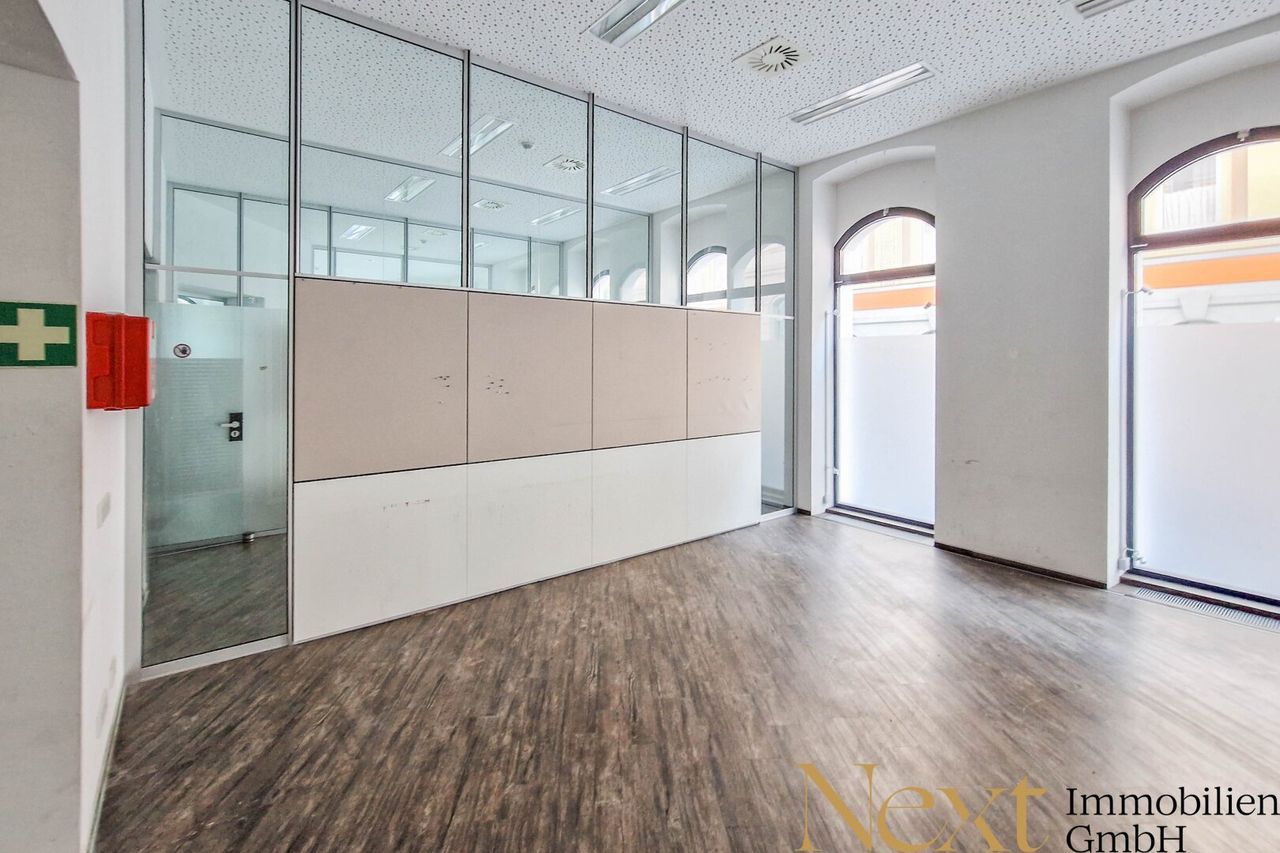 Hochwertige, lichtdurchflutete Geschäfts-/Bürofläche im Zentrum von Linz zu vermieten! Diese ebenerdige Bürofläche verfügt über insgesamt ca. 294,27m² und überzeugt mit einer großzügigen Deckenhöhe von ca. 3,60m. Dank clever eingesetzter Glaselemente stehen insgesamt 7 flexibel nutzbare Büroräume zur Verfügung, die sich optimal an unterschiedliche Bedürfnisse anpassen lassen. Ein barrierefreier Zugang ist durch eine Rampe gewährleistet. Zudem punktet die Fläche mit perfekter Sichtbarkeit und bietet hervorragende Möglichkeiten zur Außenwerbung.