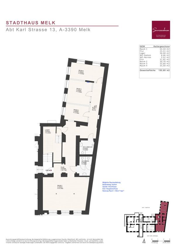 Das Geschäftslokal/Büro befindet sich direkt im "Stadthaus Melk" mit 24 Betreuten Wohnungen plus eine gemeinschaftlich genutzte Wohnung für Seniorinnen und Senioren. Dieses Lokal wird im Edelrohbau (mit Estrich, Fußbodenheizung, Anschlüsse vorbereitet) übergeben und befindet sich straßenseitig im Souterrain / gartenseitig im Erdgeschoss und kann vielseitig genutzt werden. Bezugsfertig Q2/24