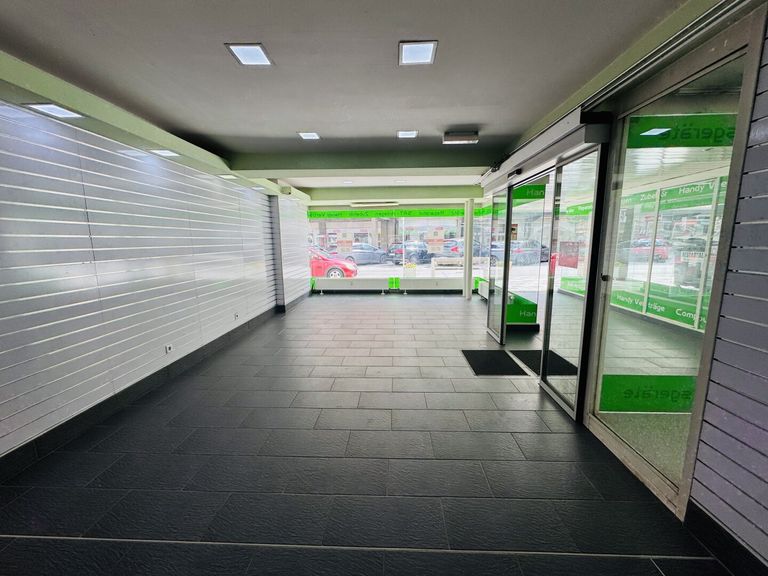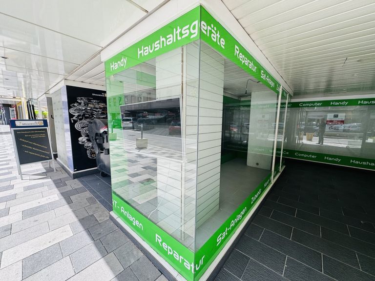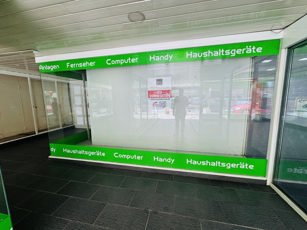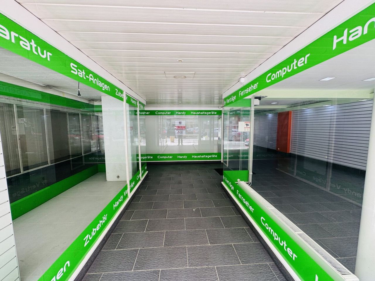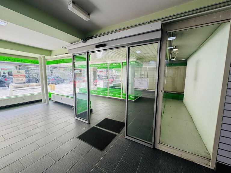 Große Schaufensterfront mit automatischer Glastür zum frequentierten Hauptplatz