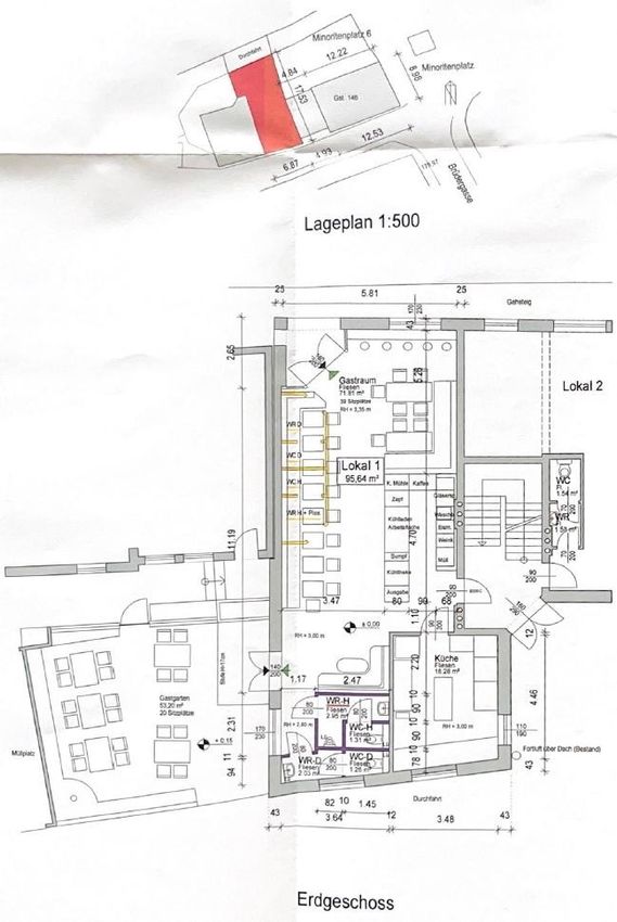 Das Erdgeschoss ist ebenerdig und barrierefrei zugänglich und verfügt über eine Fläche von ca. 96 m² mit ca. 39 Sitzplätzen. Zusätzlich gibt es einen Gastgarten mit ca. 53 m² und ca. 29 Sitzplätzen. Das Kellergeschoss bietet weitere ca. 58 m² Nutzfläche.
