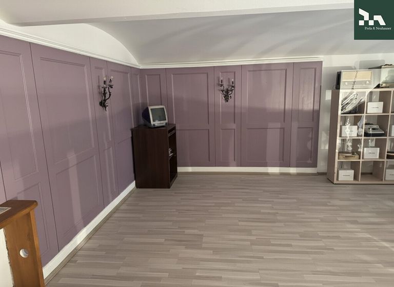 Im Erdgeschoß (1. Ebene), das sowohl straßenseitig als auch über den Innenhof betreten werden kann, befindet sich ein heller Verkaufsraum mit einem großen Portal sowie ein angrenzender zweiter Raum. Zusätzlich sind hier ein (Kunden-)WC sowie eine Teeküche vorhanden. Über die Treppe gelangt man in das Zwischengeschoss (2. Ebene), wo sich ein...