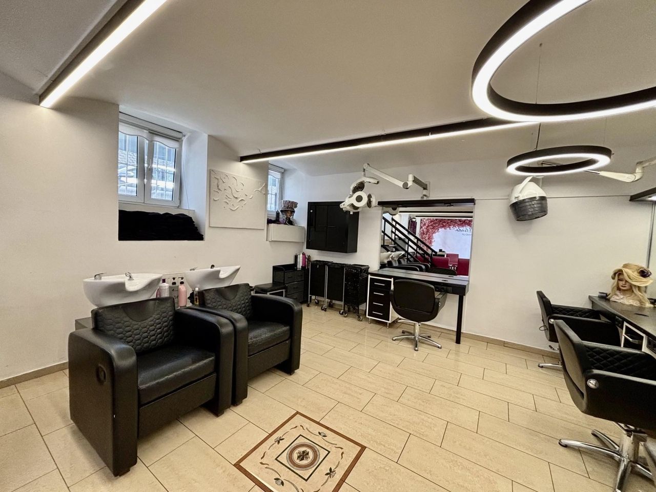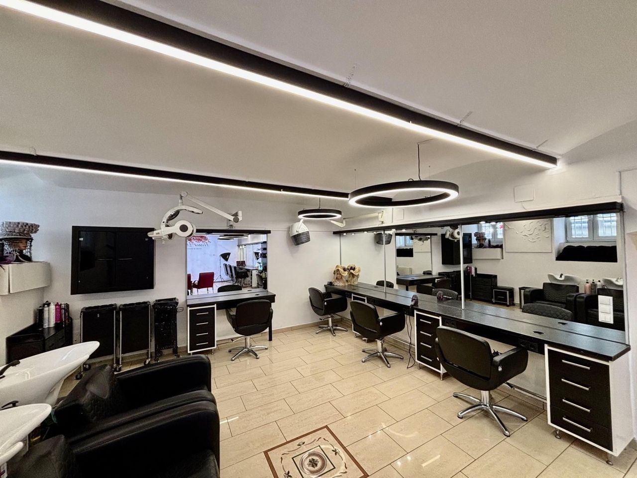 Der Salon bietet Platz für 7 Frisierstühle sowie 2 Rückwärtswaschanlagen mit Stuhl, zudem sind 8 Warteplätze vorhanden – perfekt für einen reibungslosen Kundenverkehr. Für ein angenehmes Ambiente sorgen ein hochwertiger Granitboden sowie eine moderne Beleuchtung, die im Jahr 2024 auf energieeffiziente LED-Leuchten umgestellt wurde. Das gesamte Mobiliar wurde im Jahr 2019 erneuert und befindet sich in ausgezeichnetem Zustand.