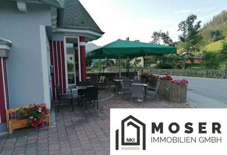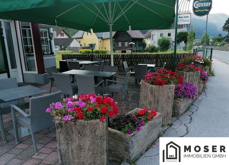 Fast der gesamte Grundstücksbereich ist mit dicken farbigen Betonsteinen gepflastert, welche auch mit LKW befahren werden können. Der Außenbereich wird hauptsächlich als Gastgarten genutzt mit 50 Sitzplätzen - teilweise überdacht.
