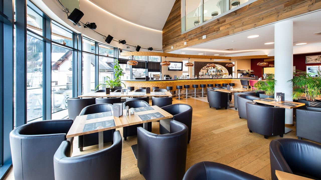 Der offen gestaltete Bar- und Restaurantbereich im ersten Obergeschoss überzeugt durch seine moderne Formensprache, natürliche Materialien, hochwertiges Mobiliar und das warme Spiel aus Licht und Glas. Die Panoramafenster holen die Landschaft direkt ins Haus – ideal für Tagesbetrieb und Abendveranstaltungen.