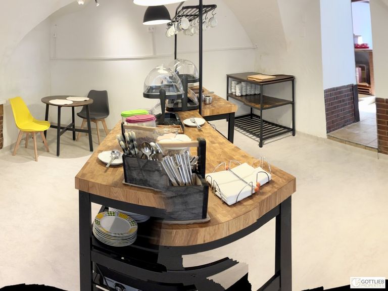 Im Erdgeschoß befinden sich eine Rezeption, eine Küche, ein Frühstücksraum, ein Restaurant und eine Bierstube für insgesamt 60 Personen.