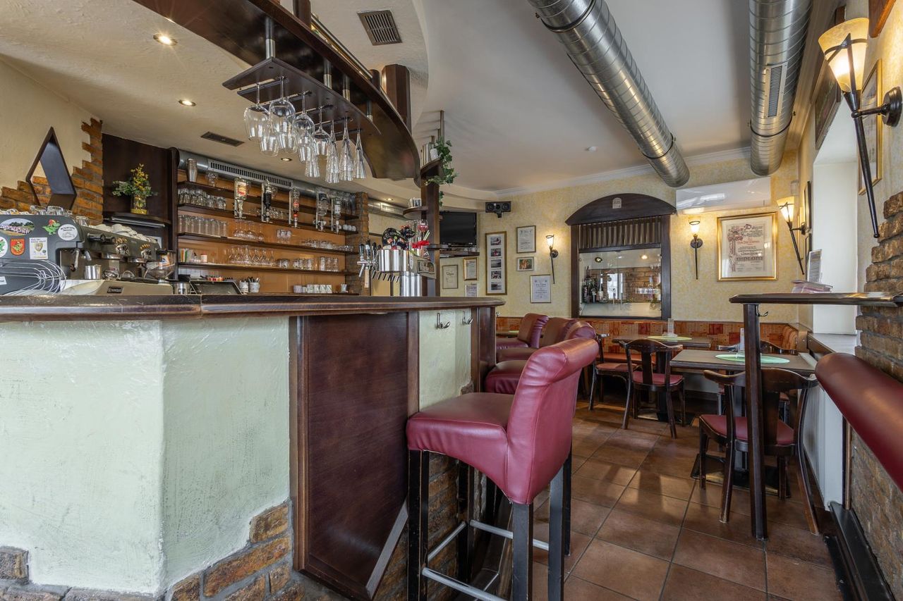 * Stehtische und Sitzplätze im Gastroraum mit Theke