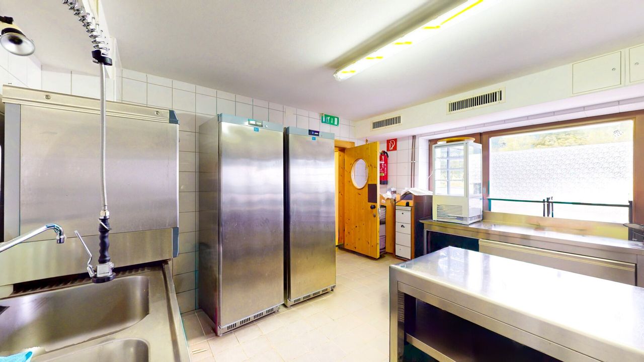 Der Gewerbebereich für die Bewirtung liegt ebenerdig, zentral erschlossen: links die modern ausgestattete Küche (Küchenneuausstattung vorgesehen) mit professioneller Infrastruktur; rechts zwei gemütliche Gasträume mit typischer Kieferholz-Vertäfelung und Kiefernmöblierung. In einem der Räume ist die Theke mit...