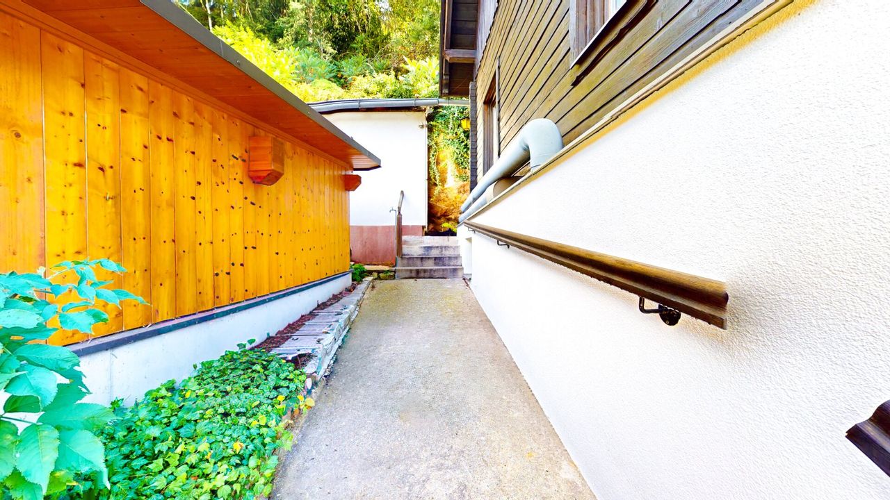 Auf dem Grundstück finden Sie ein Carport für zwei PKW, einen zusätzlichen Geräteschuppen sowie ein separates Gebäude im oberen Grundstücksbereich, in dem die Heizung und das Pelletsilo untergebracht sind. Dort befinden sich außerdem ein Holzlager und ein Lagerraum mit Waschbecken — praktische Nebennutzflächen, die den Betriebsalltag effizient unterstützen. Das großzügige Grundstück bietet Raum für Gästeparkplätze, eine Außenterrasse oder einen Biergarten.