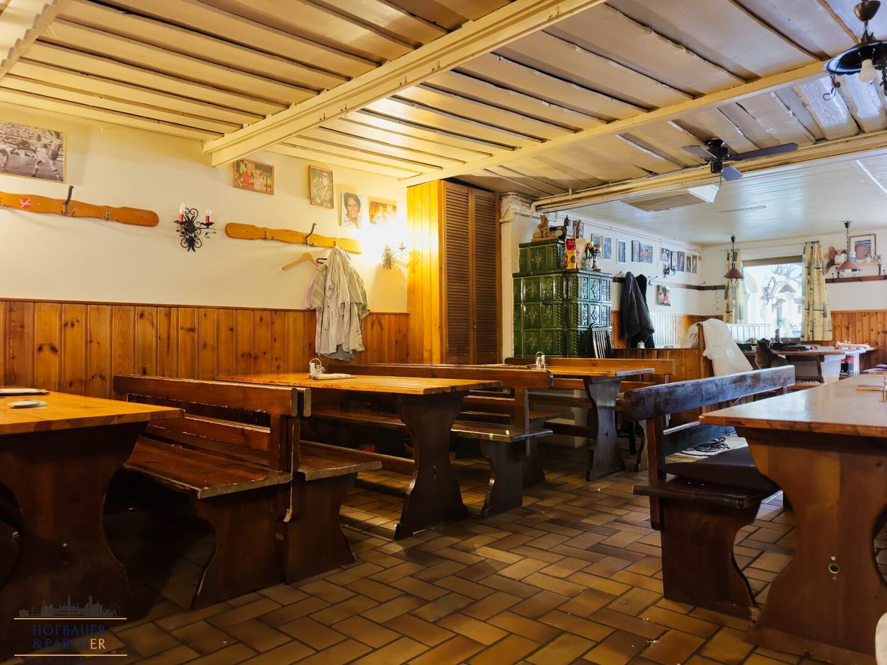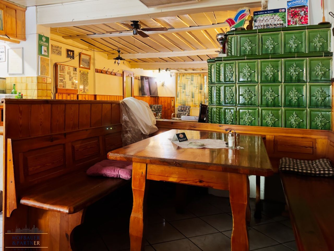 Der Gastraum verfügt über rund 80 Sitzplätze und strahlt durch den erhaltenen Kachelofen eine gemütliche Atmosphäre aus. Eine zusätzliche Gasheizung sorgt für verlässliche Wärmeversorgung. Die Küche wurde bereits vor etwa zwei Jahren modernisiert und ist funktional ausgestattet. Im selben Zeitraum wurden auch die Fenster sowie das Dach des hinteren Gebäudeteils erneuert – wichtige bauliche Schritte, die den Grundstein für eine weiterführende Sanierung legen.