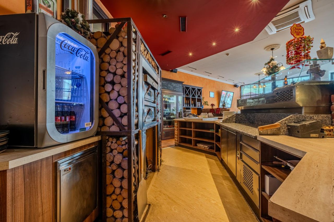 Auf rund 500 m² Nutzfläche stehen im Innenbereich etwa 150 Sitzplätze, eine großzügige Bar, eine Pizza-Schauküche, eine voll ausgestattete Gastroküche mit zwei Kühlhäusern sowie Damen- und Herren-WC zur Verfügung. Ergänzt wird das Platzangebot durch eine Gastterrasse mit ca. 100 Sitzplätzen und einen ca. 80 m² großen Keller.