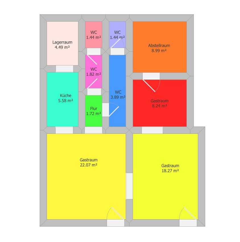 Das Restaurant überzeugt durch eine funktionale und gut nutzbare Raumaufteilung. Die drei separaten Gasträume bieten ausreichend Platz für Gäste und ermöglichen eine flexible Gestaltung des Gastronomiekonzepts. Ergänzt wird das Raumangebot durch einen Flur, einen Lagerraum sowie einen zusätzlichen Abstellraum, die für einen reibungslosen Betriebsablauf sorgen.