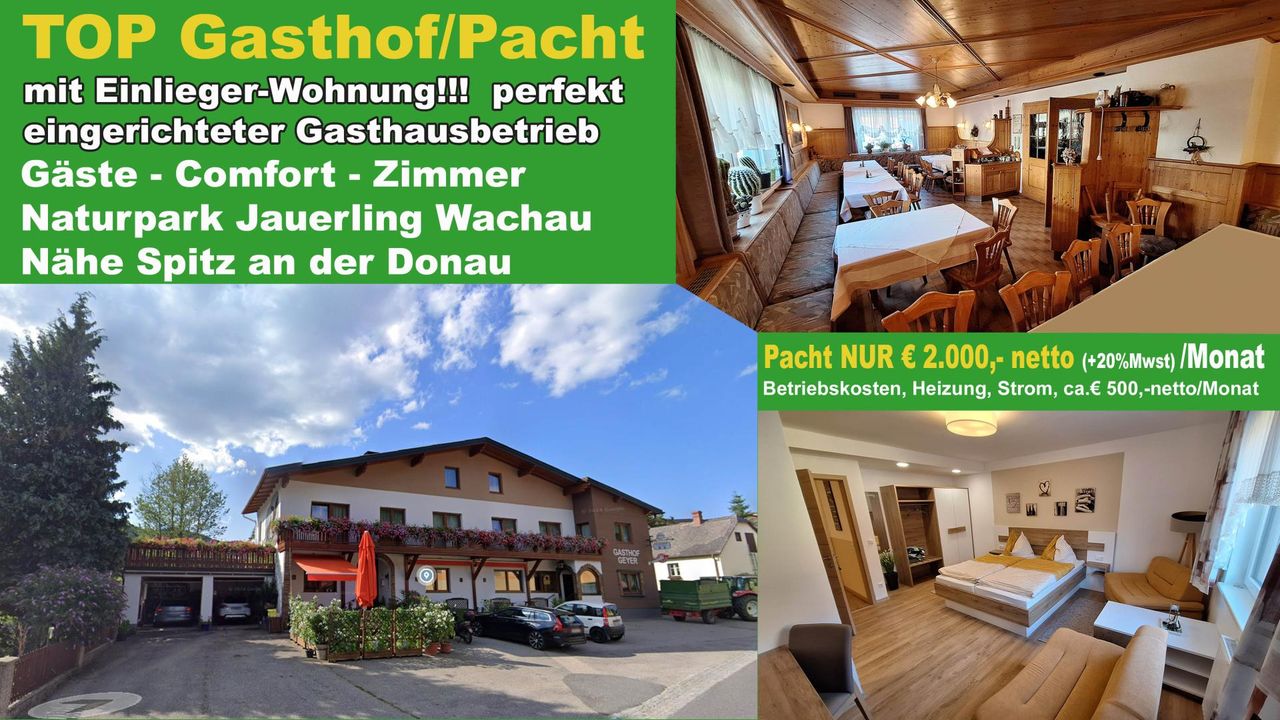 Top gepflegter Gasthof mit Gästezimmer/Naturpark Jauerling Wachau sucht neuen Betreiber. Objektbeschreibung: Der besonders schön ausgestattete und gepflegte Gasthof Gayer ist ein langjähriger und gut eingeführter Familienbetrieb. Das Haus wurde 1974 in Massivbauweise mit, für die Region typischer Holzverkleidung und Balkonen errichtet. Das Objekt bietet auf zwei Etagen, einem Keller und einem Dachboden genügend Raum für alle erdenklichen gastronomischen Aktivitäten. Die Mitbenützung des Gemüse -und Obstgarten ist im Pachtbetrag enthalten. Der Pächter kann diesen bewirtschaften und der Ertrag für sich verwenden. Lage: Das Haus liegt im Naturschutz und beliebtem Ausflugsgebiet Naturpark Jauerling Wachau. Die Ruhige Lage ist auch für Pensionsgäste ein...