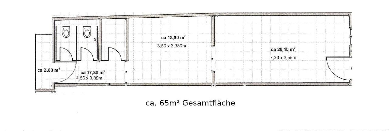ca. 17,20m² einem Lagerraum, einer Sanitäranlage, bestehend aus Waschraum und 2 Toiletten (Herren- und Damen-WC)