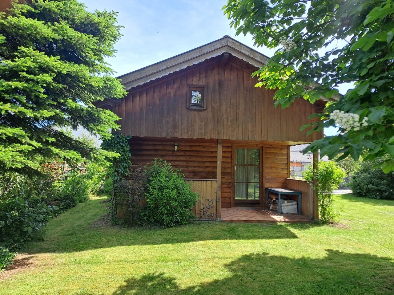 Gartenhaus ist teilunterkellert, im Erdgeschoß befindet sich Wohnraum mit Küche, WC, Terrasse, im Obergeschoß eine Galerie mit Schlafmöglichkeit.