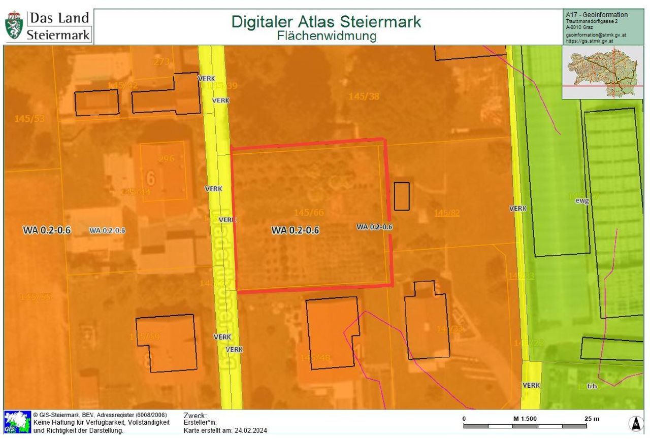 Gemäß dem rechtskräftigen örtlichen Entwicklungskonzept der Gemeinde Stainz ist das Grundstück als WA (Allgemeines Wohngebiet) ausgewiesen und liegt somit im Baulandgebiet.