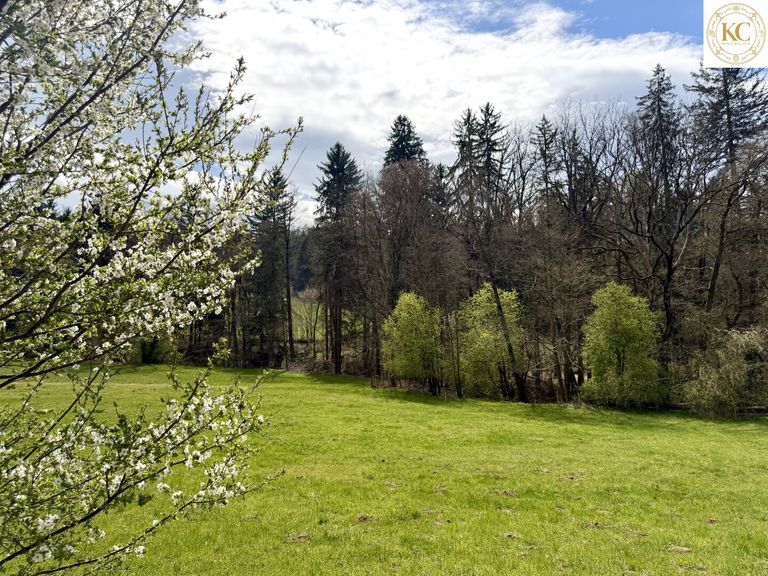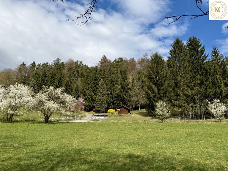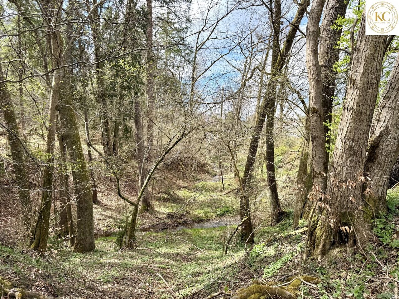 Die verbleibenden ca. 1.004 m² sind als Wald ausgewiesen. Ein Bach entlang der Grundstücksgrenze mit altem Baumbestand schafft eine besonders ruhige und naturnahe Atmosphäre. Dieser Bereich ist dauerhaft unverbaubar.