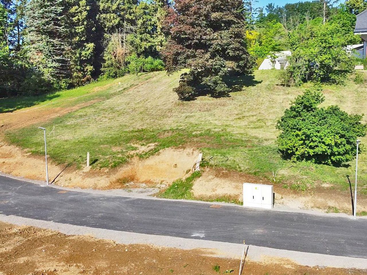 Die Erschließung ist nahezu vollständig abgeschlossen: Wasser-, Kanal- und Internetanschlüsse sind vorhanden, die Zufahrt ist asphaltiert und durch Straßenbeleuchtung ergänzt. Lediglich die Elektroanschlussgebühr (ca. EUR 10.000) ist vom Käufer zu tragen. Damit ist eine klare und transparente Kostenbasis für den Hausbau gegeben.