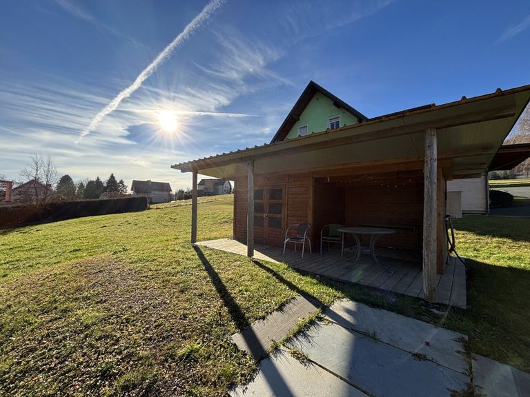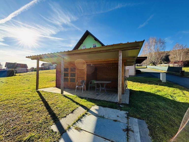 Ein bestehendes Holzgebäude mit überdachter Terrasse ist bereits vorhanden und kann während der Bauphase praktisch genutzt werden. Strom ist direkt am Grundstück verfügbar, was Ihre Bauplanung zusätzlich erleichtert. Ein besonderes Highlight ist der kleine Bach, der entlang der Grundstücksgrenze verläuft und dem Grundstück einen idyllischen, naturnahen Charakter verleiht.