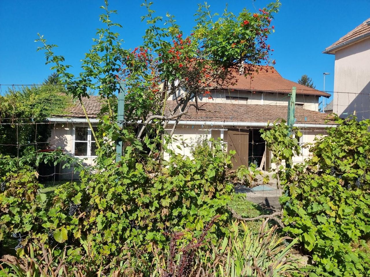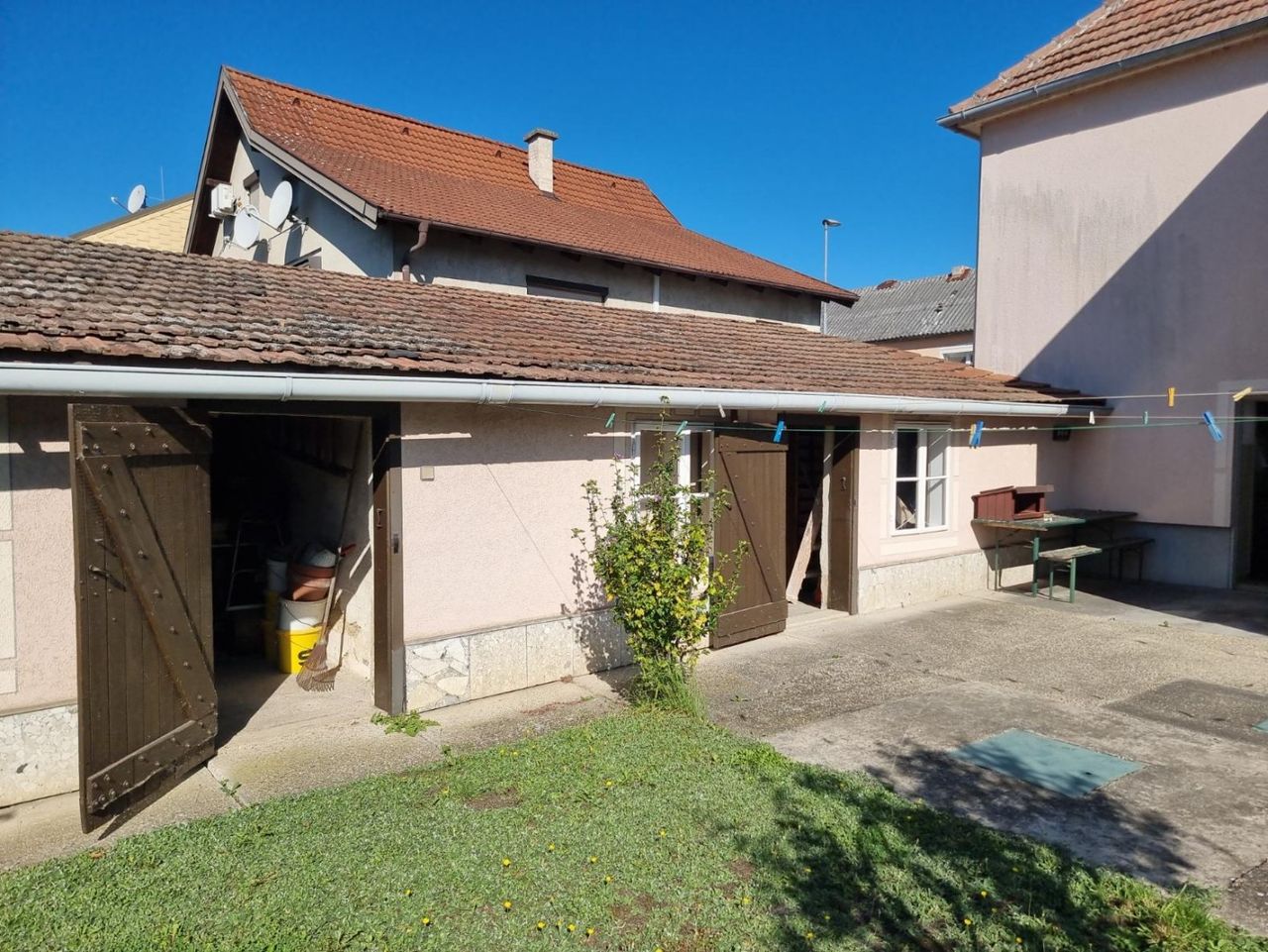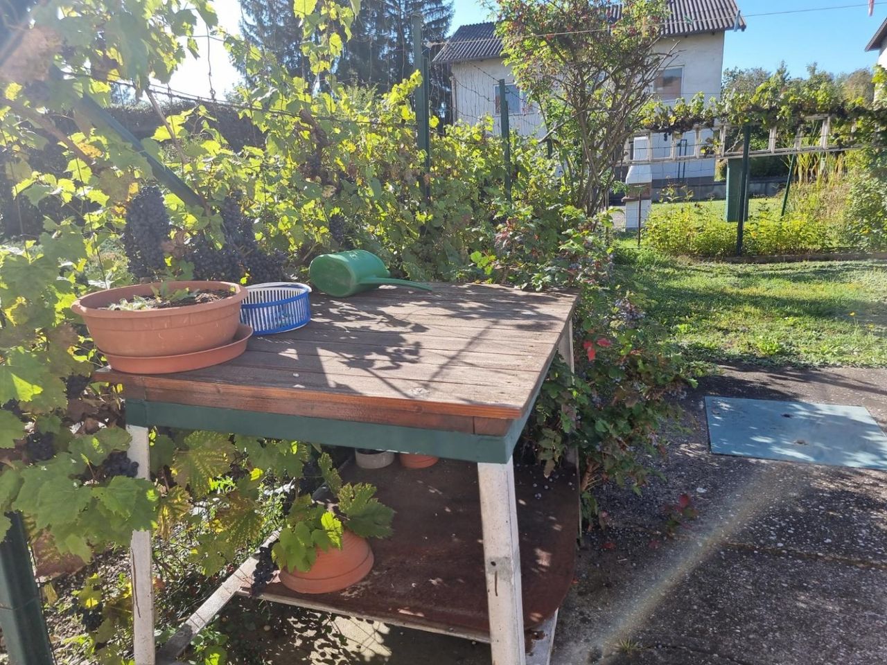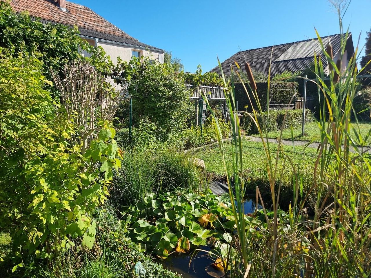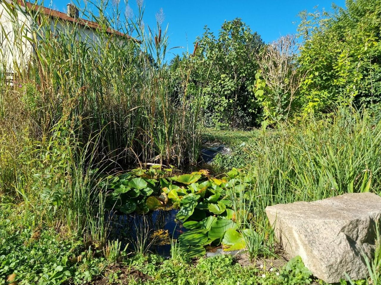 Eine Schönheit ist der Garten mit seiner kleinen, verwachsenen Laube, den Weinranken entlang des Weges, dem gemauerten Grill, dem geschlagenen Brunnen mit Bassin und dem Goldfisch-Biotop. Hier finden Sie auf ca. 550m² Gartenfläche viele kleine, liebenswerte Refugien und Rückzugsorte für Ihre Familie. Von der Terrasse aus gelangt man in die Werkstätte und seitlich davon in die beiden Nebengebäude. Rechts & Links vom Haus befindet sich eine Parkfläche oder Platz für eine Garage.