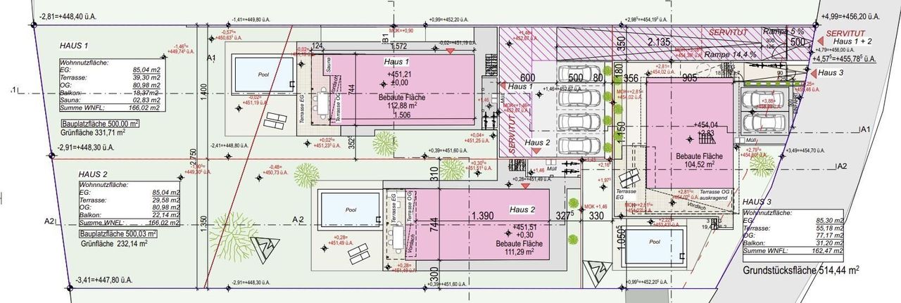 Die derzeitige Planung für die Wohnhäuser sieht Wohnnutzflächen zwischen 162 und 166m² pro Wohnhaus vor. Kundenspezifische Anpassungen (Reduktion Wohnfläche, Ausführungsdetails,..) sind derzeit noch möglich, sofern diese das Erscheinungsbild des Gesamtprojektes nicht negativ beeinflussen. Dadurch können sich die angegebenen Verkaufspreise in beide Richtungen verändern.