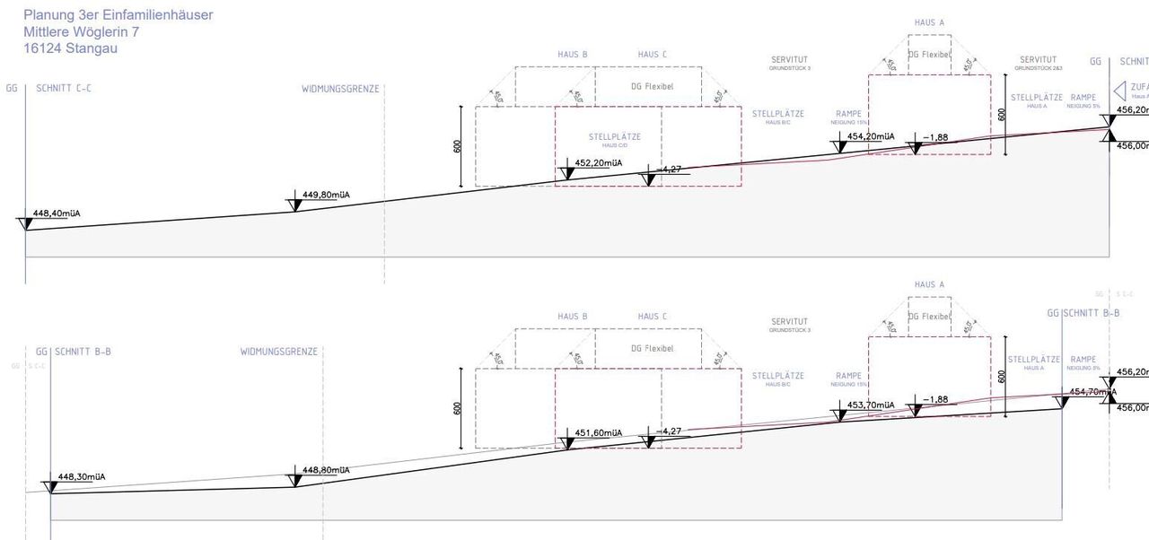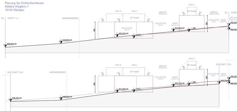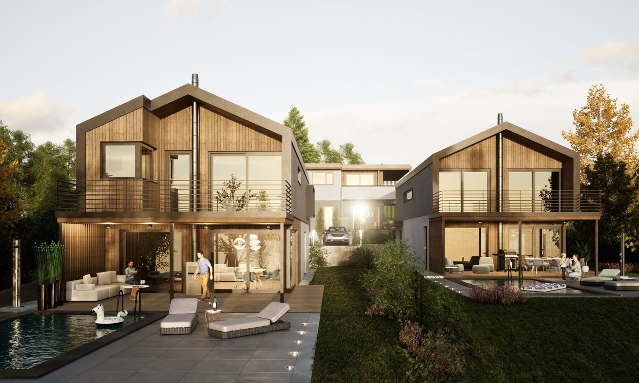 Durch eine Teilung des Gesamtgrundstückes in 3 Einzelparzellen entstehen 3 Grundstücke mit 515, 732 und 831m². Die derzeitige Planung sieht die Errichtung von hochwertigen Wohnhäusern (Wohnfläche ca. 150m²) in Holz-Massivbauweise durch einen Premium-Hersteller in einem modernen Chalet-Baustil vor. Um der Exklusivität der Gesamtanlage zu entsprechen wird eine repräsentative Einfriedung und Einfahrtssituation mit Tor/Sprechanlage vorgesehen. Die Allgemeinflächen werden mit Granit-Kopfsteinpflaster ausgeführt, eine großzügige gärtnerische Gestaltung im Bereich der KFZ-Stellplätze unterstreicht die Wertigkeit und Exklusivität der Gesamtanlage.