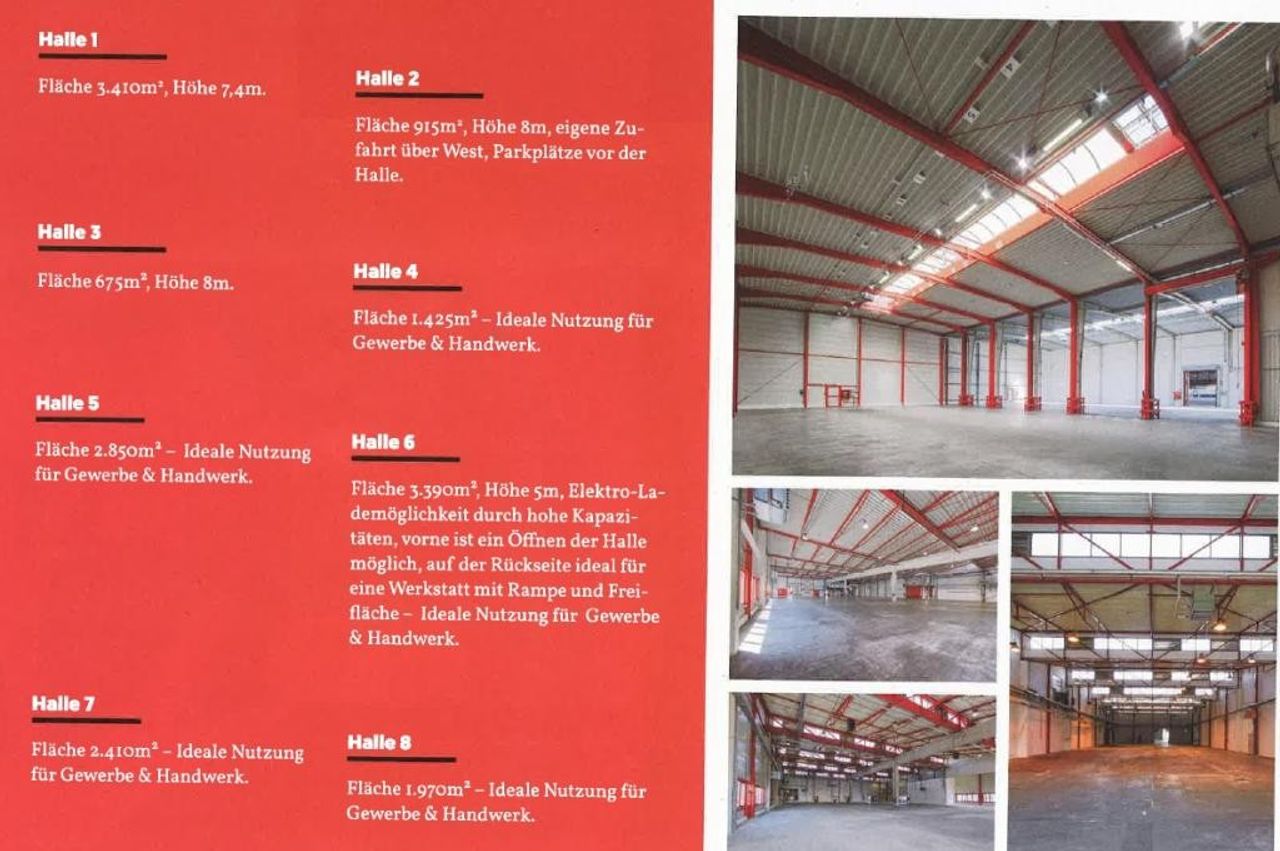 17.000 m2 Hallenkomplex- 2 x 1000 m2 Halle -ausweitbar auf 4000 m2 und 377m2 Büro im Loft und 190m2 Bür im EGfrei