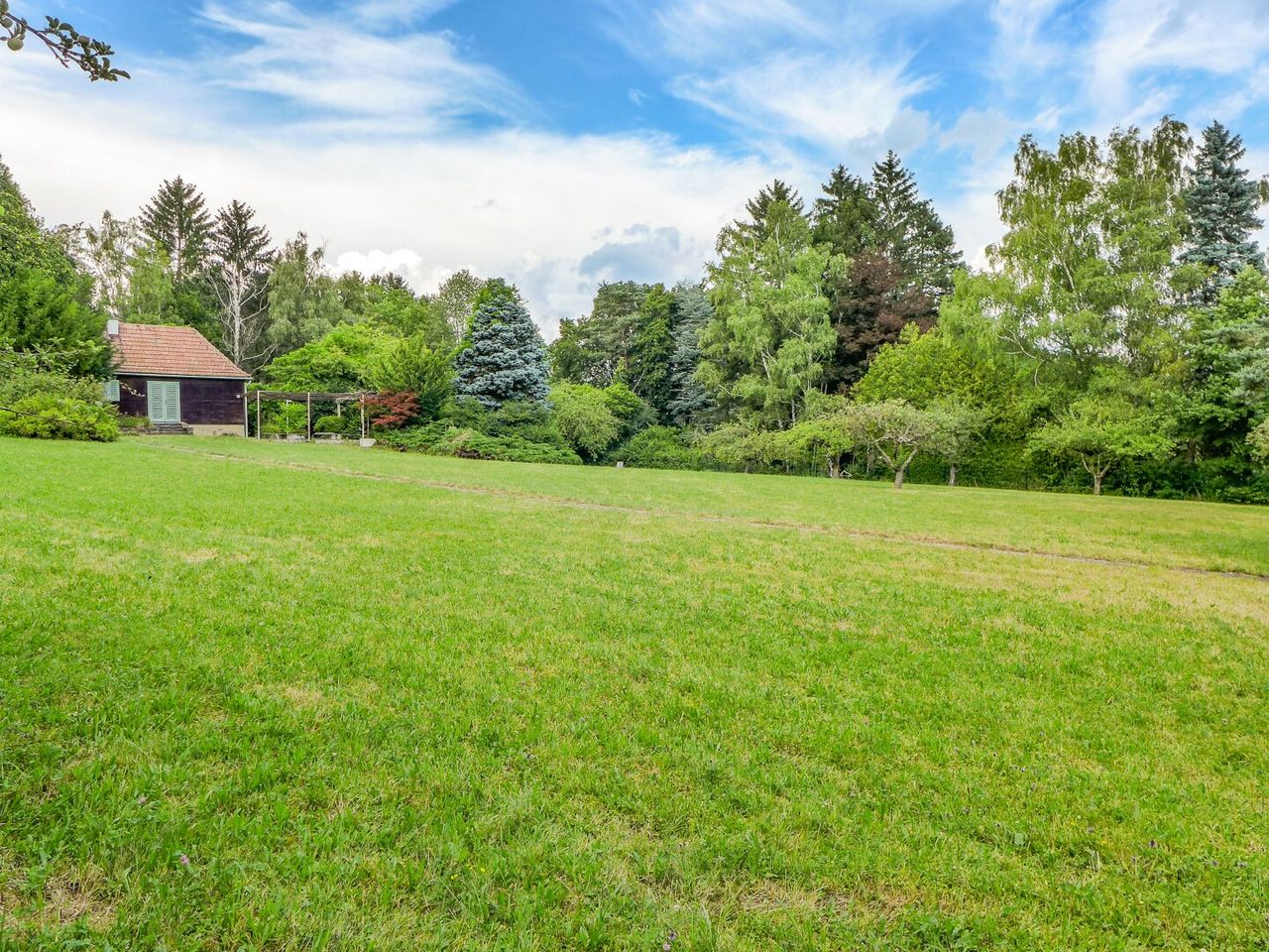 Das mittlere Grundstück (2.120 m²) ist derzeit mit einem sanierungsbedürftigen Holzhaus (ca. 45 m² Grundfläche) sowie zwei kleinen Holzschuppen bebaut. Die Erschließung ist vollständig vorhanden – Ortswasser, Kanal und Strom sind bereits angeschlossen. Zusätzlich steht ein eigener Brunnen zur Verfügung. Der Umzäunung der gesamten Liegenschaft wurde erst 2023 vollständig erneuert.