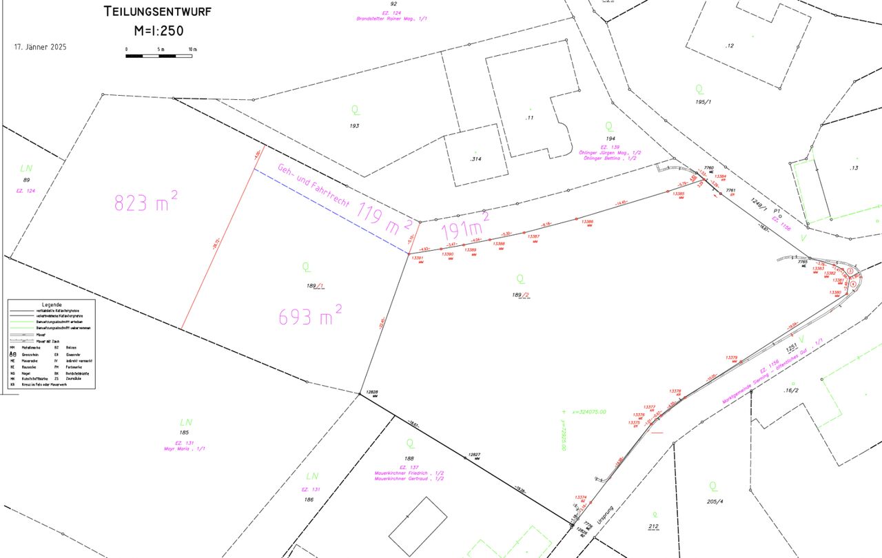 Die ca. 823 m² große Parzelle entsteht aus einer geplanten Grundstücksteilung. Die Zufahrtsstraße befindet sich auf dem Nachbargrund und soll mit einem grundbücherlich eingetragenen Recht ab gesichert werden, sodass Ihnen eine sorgenfreie und langfristige Straßennutzung garantiert ist. Die Straßenerrichtungskosten sind im Verkaufspreis bereits anteilsmäßig berücksichtigt worden.
