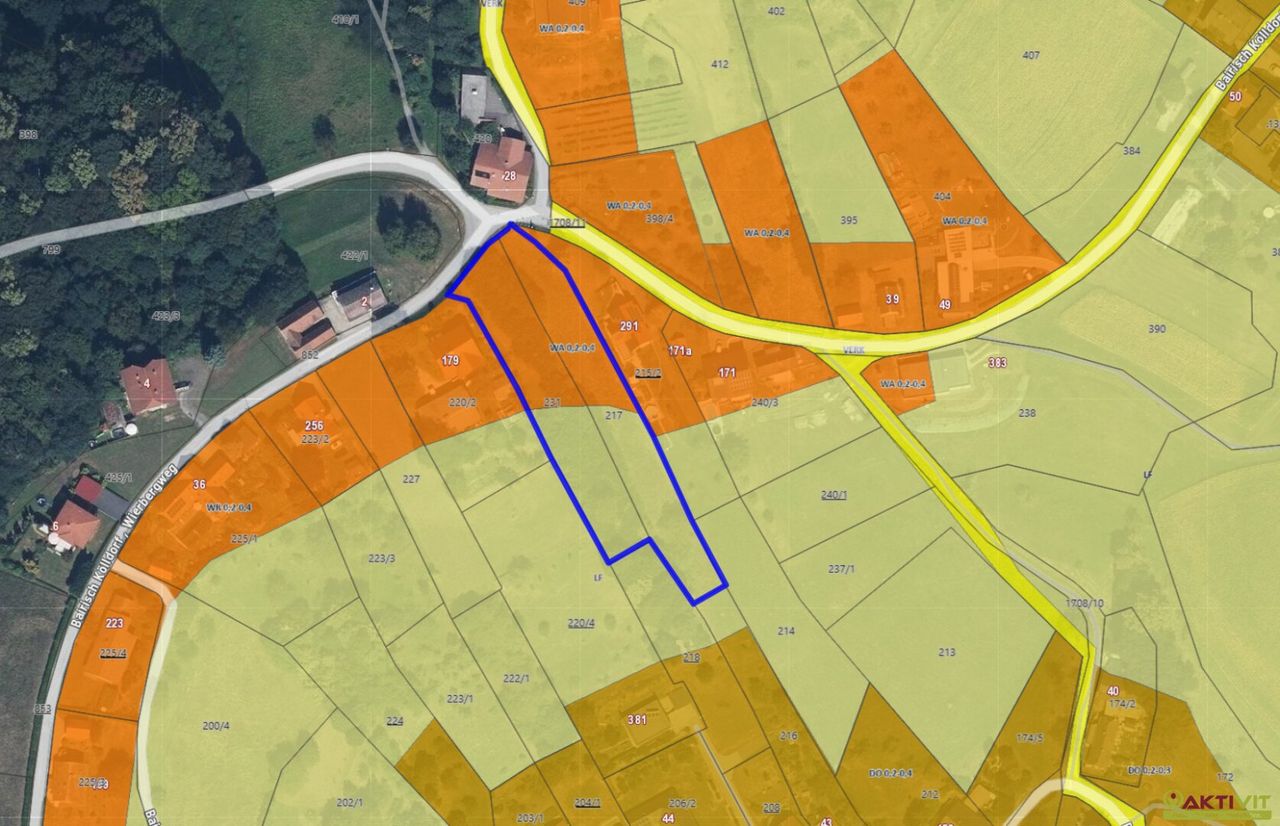 Zum Verkauf gelangen zwei nebeneinanderliegende Grundstücke mit einer Gesamtfläche von ca. 3.712 m² . Laut vorliegender Planung und Flächenwidmung entfallen rund 1.860 m² auf Bauland mit der Widmung „WA – Allgemeines Wohngebiet“ und einer Bebauungsdichte von 0,2–0,4 . Die verbleibende Fläche ist als „LF – Land- und forstwirtschaftliche Nutzung im Freiland“ ausgewiesen.