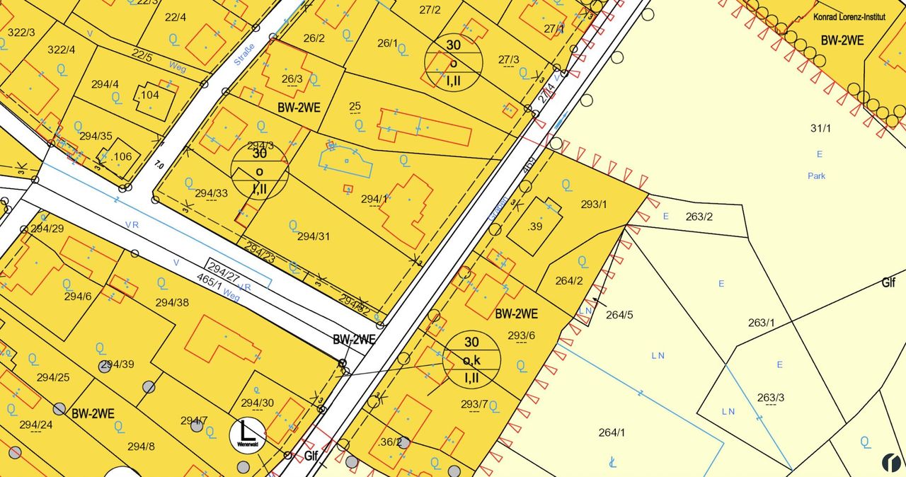 Das Grundstück ist als Bauland-Wohngebiet gewidmet und bietet die Möglichkeit zur Errichtung von max. zwei Wohneinheiten. Die Bebauung ist zu 30 % möglich, vorgesehen ist eine offene Bauweise in Bauklasse I und II. Die Grundstücke wurden erst kürzlich geteilt, daher sehen Sie am Flächenwidmungsplan noch nicht die richtige Lage und Bezeichnung. Bitte entnehmen Sie diese dem Teilungsplan.
