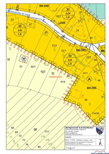 Flächenwidmungen: Bauland-Wohngebiet (maximal 2 Wohneinheiten pro Grundstück, daher insgesamt 4 Wohneinheiten) sowie Grünland (Land- und Forstwirtschaft)