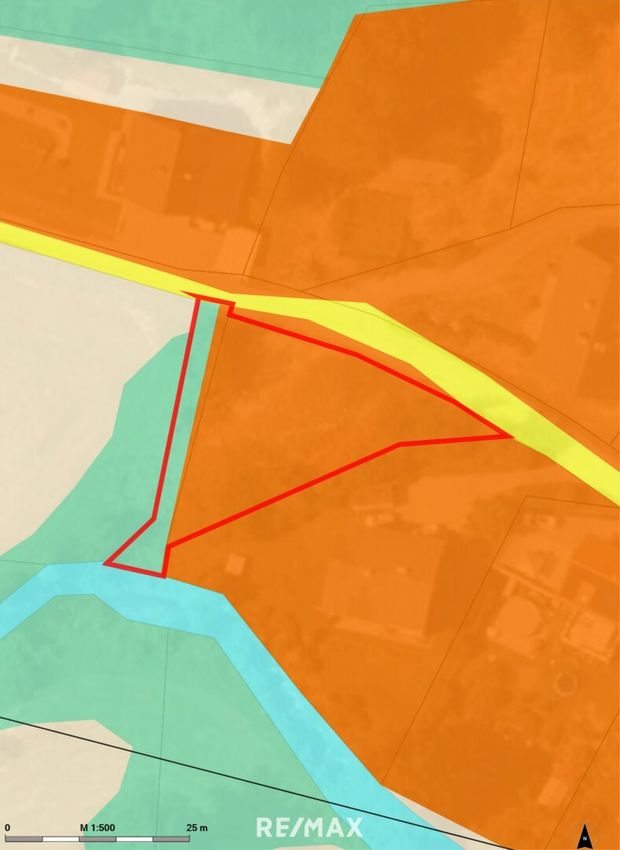 Der obere Bereich vom Grundstück bildet ein natürliches Plateau, dass sich ideal für die Errichtung eines Wohnhauses eignet. Von dort geht das Grundstück in ein Gefälle über. Im unteren Grundstücksareal befindet sich ein vorbeifließender Bach und ermöglicht den Zugang zu einer natürlichen Wasserquelle. Ein seltenes Naturdetail, das diesem Grundstück eine außergewöhnliche Atmosphäre verleiht.