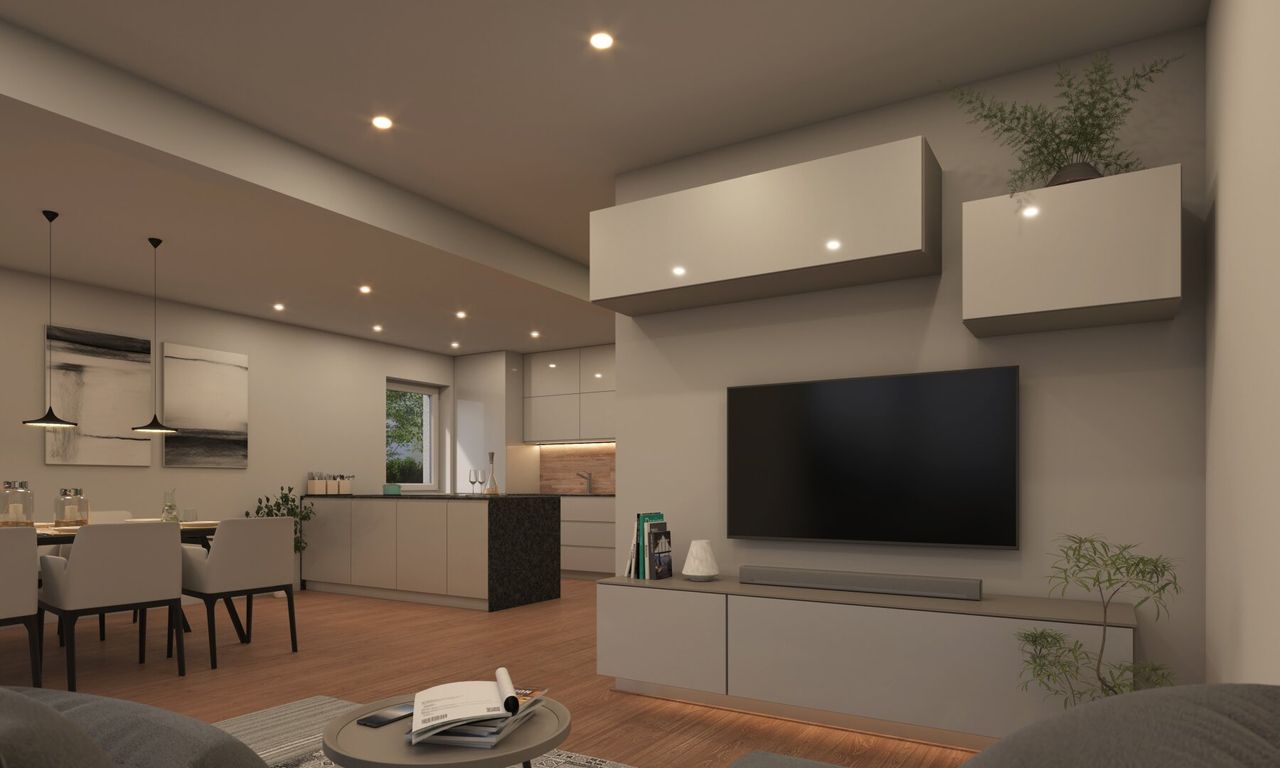 - Erdgeschoss: Gang, WC, 1 Arbeits/Schlafzimmer, Küche sowie ein großzügiger Wohn-/Essbereich