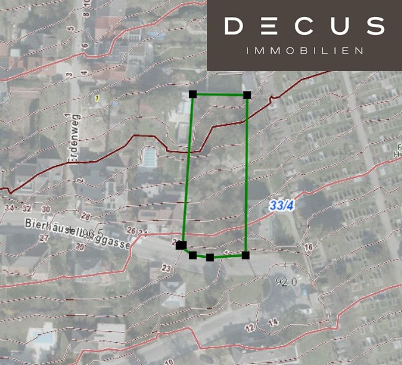 Der Geländeverlauf ersichtlich, ist der Anstieg am unteren Ende des Grundstückes am steilsten, danach flacht das Grundstück nach hinten ab und eignet sich daher fein als Garten. Garagen sind wohl am unteren Ende sinnvoll.