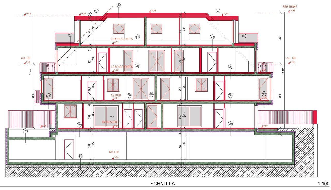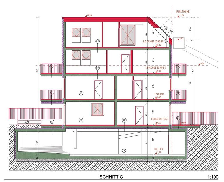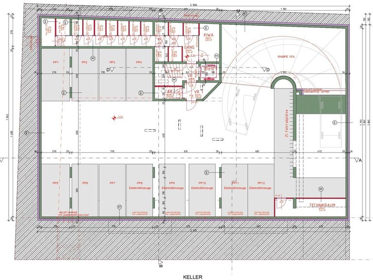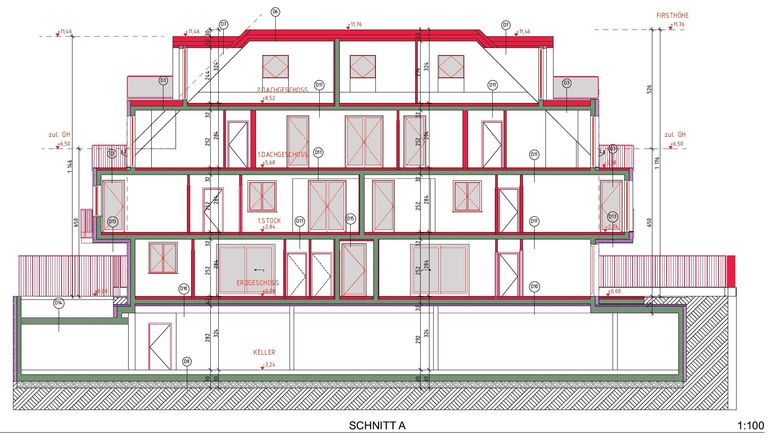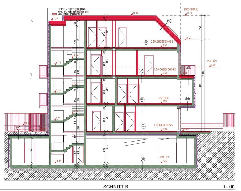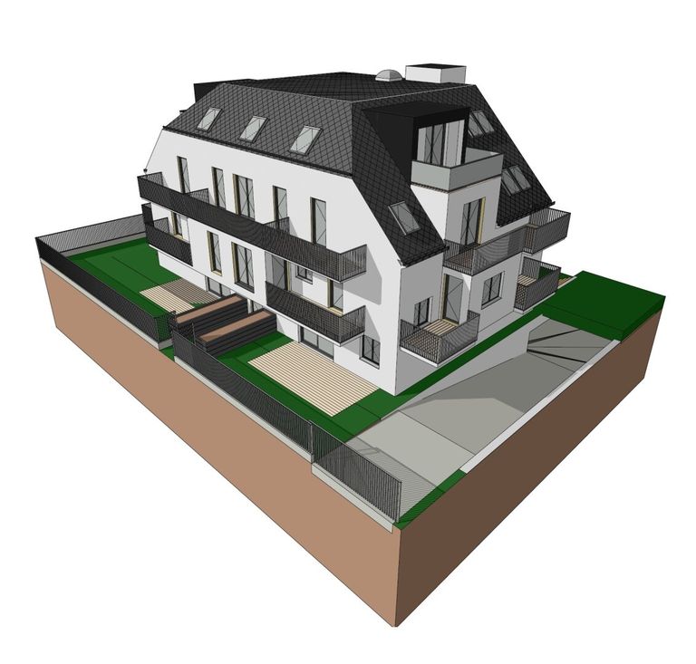 Das Projekt verfügt über einen Keller mit Garage und Kellerabteilen, einem Erdgeschoss, einem Obergeschoss und 2 Dachgeschossen, also insgesamt 5 Etagen mit 12 Stellplätzen im Keller und 13 Wohnungen vom EG bis zum 2. DG.