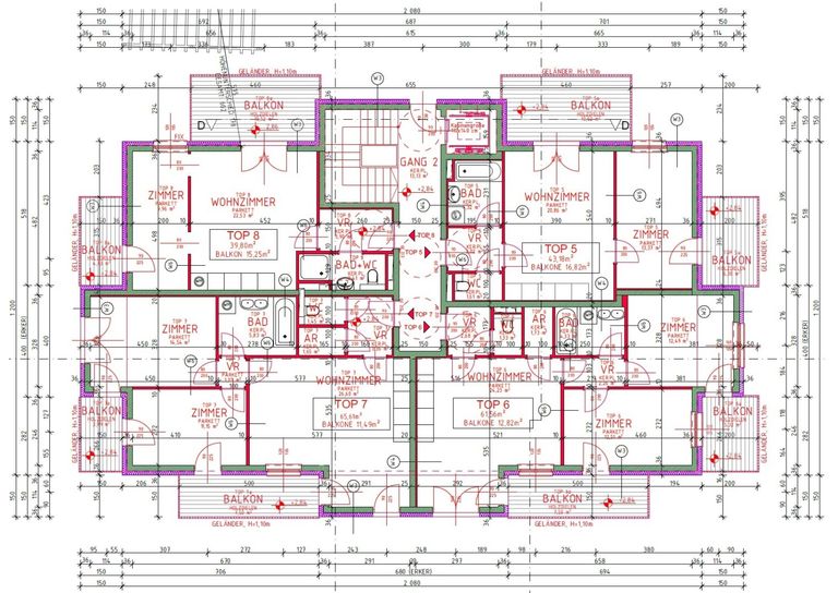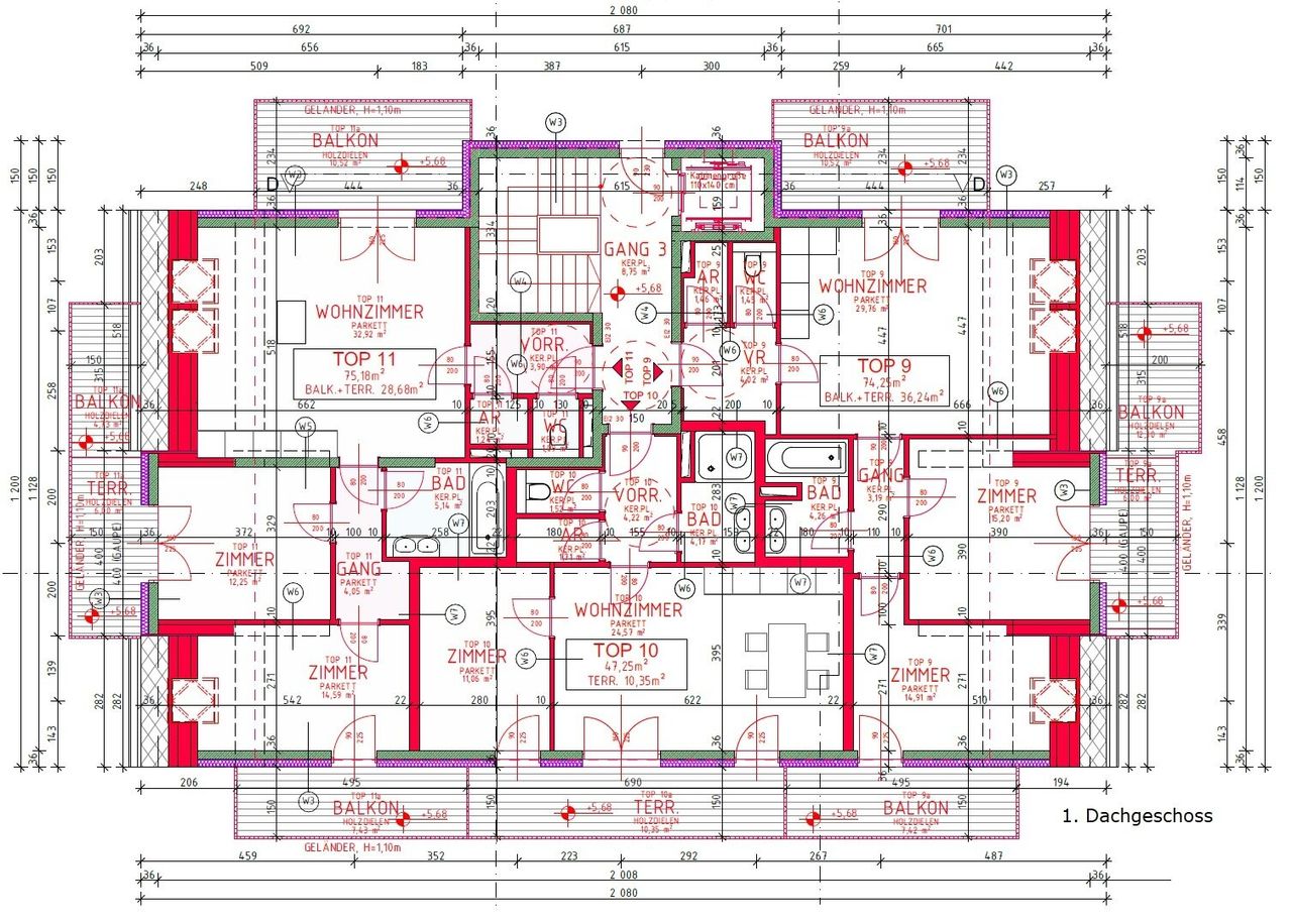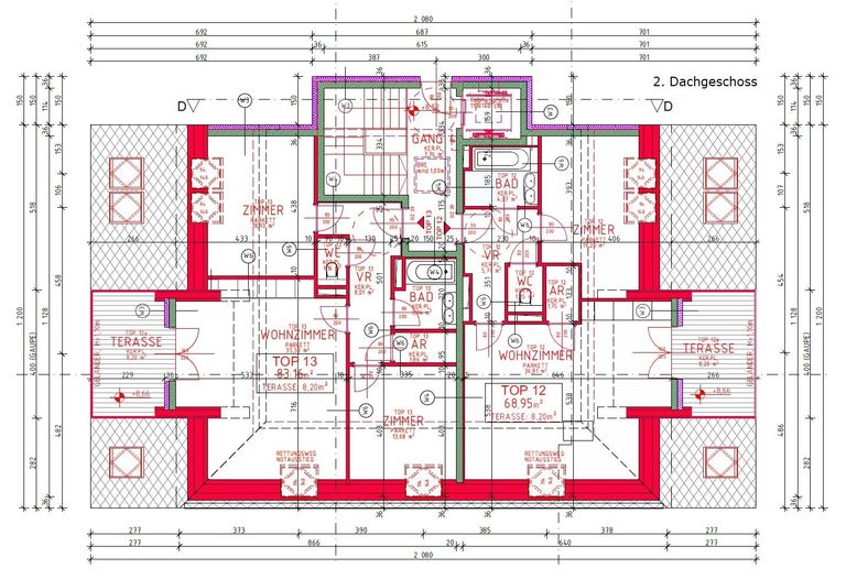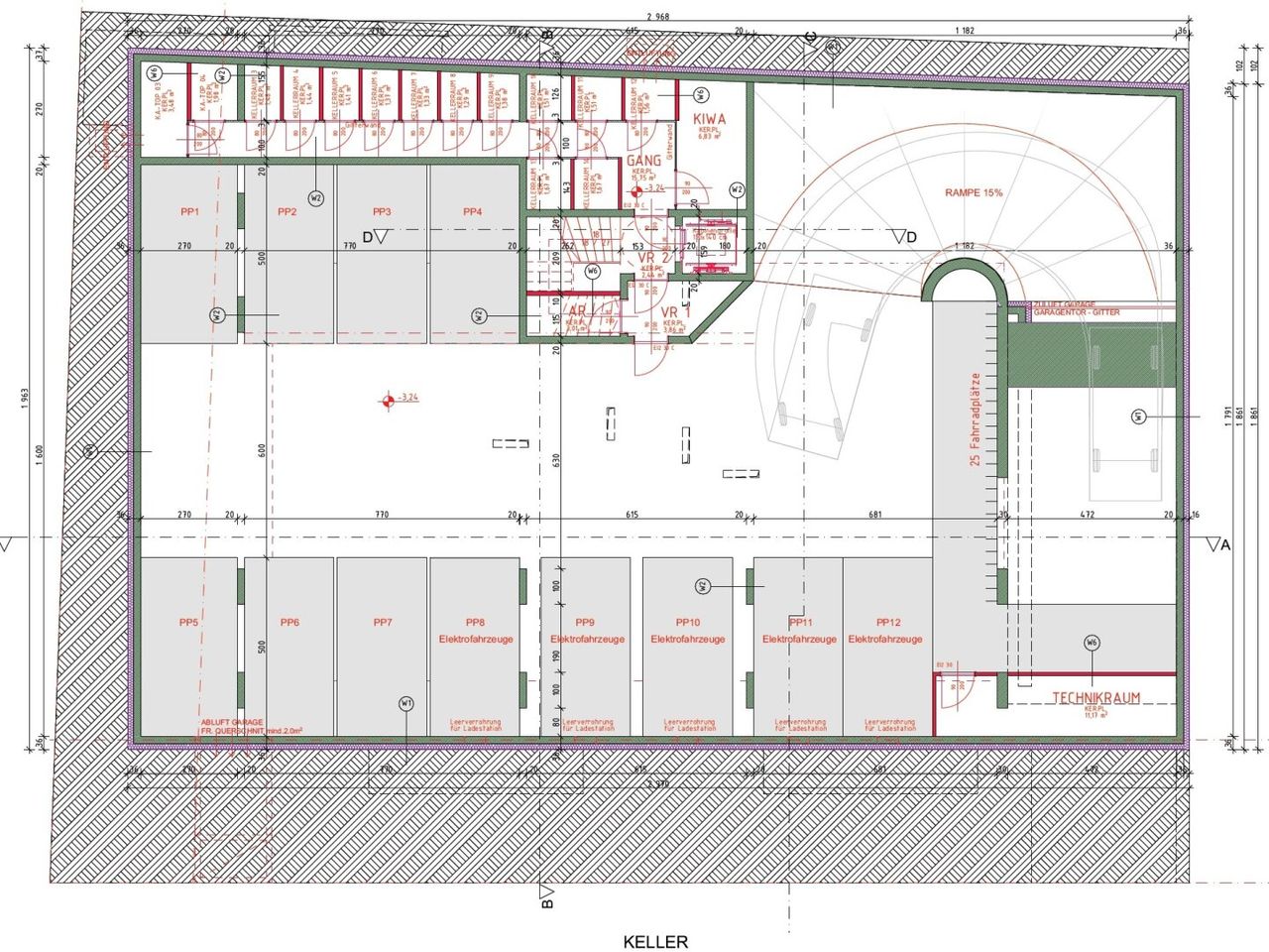 Das Projekt verfügt über einen Keller mit Garage und Kellerabteilen, einem Erdgeschoss, einem Obergeschoss und 2 Dachgeschossen, also insgesamt 5 Etagen mit 12 Stellplätzen im Keller und 13 Wohnungen vom EG bis zum 2. DG.
