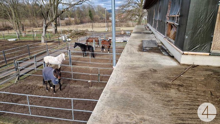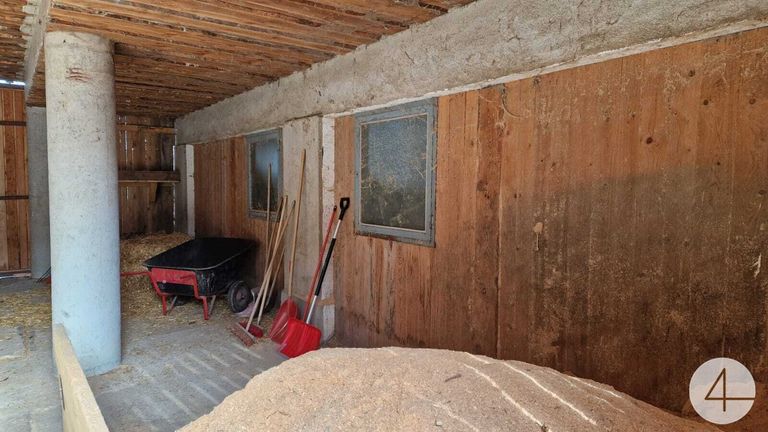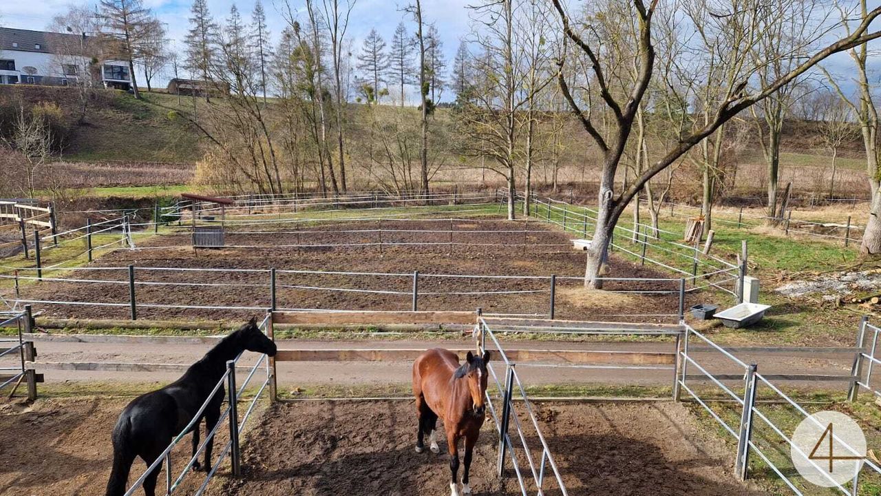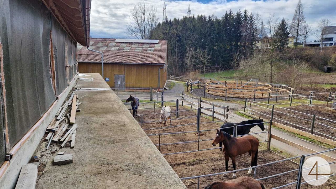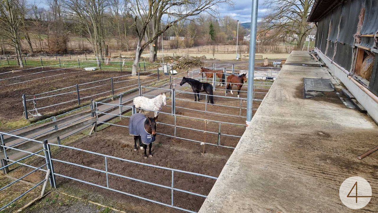 In einem anschließenden Gebäude befindet sich zur Zeit ein Pferdestall (Fotos). Im Außenbereich gibt es noch eine große Reithalle, sowie einen Geräteschuppen etc. Nicht weit vom Stall entfernt sind einige Koppeln und ein großer Reitplatz.