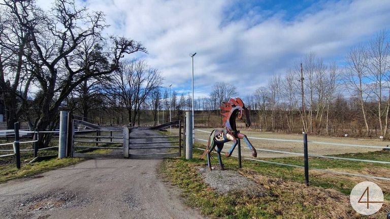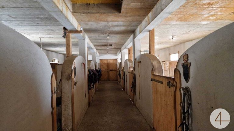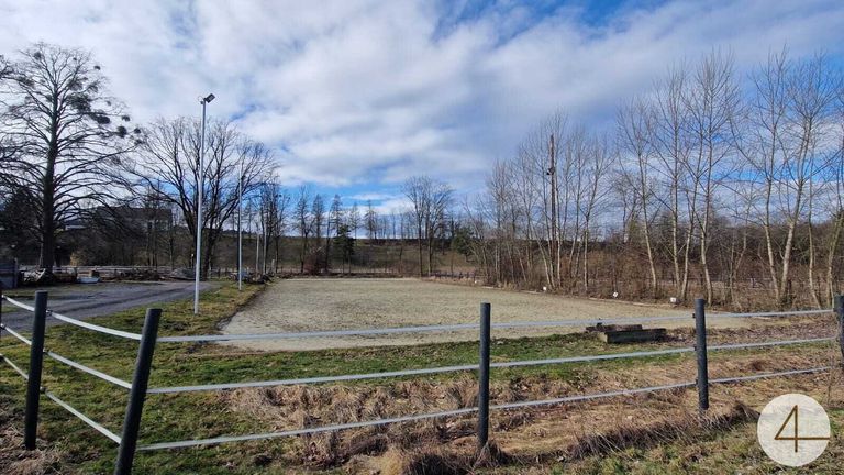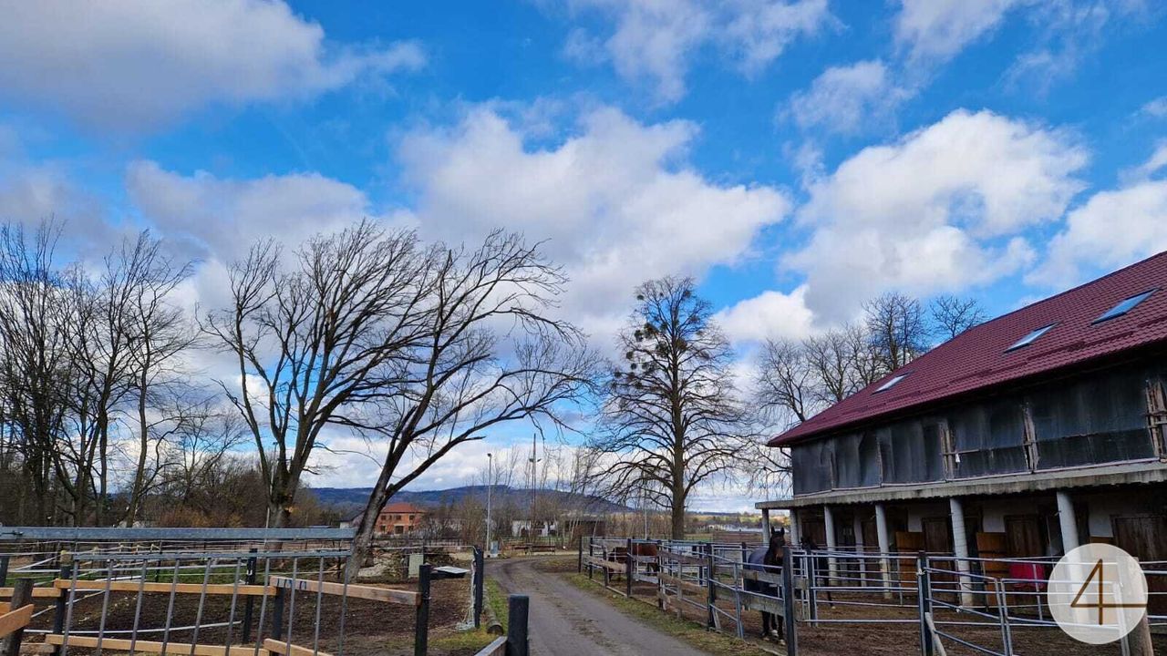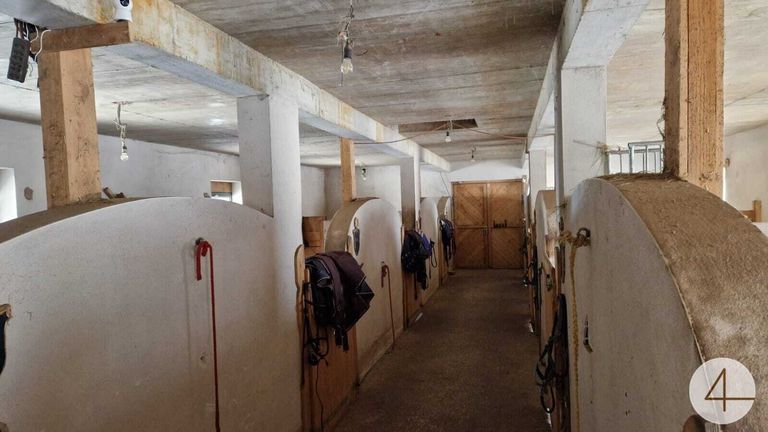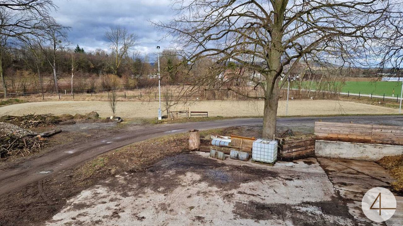 In einem anschließenden Gebäude befindet sich zur Zeit ein Pferdestall (Fotos). Im Außenbereich gibt es noch eine große Reithalle, sowie einen Geräteschuppen etc. Nicht weit vom Stall entfernt sind einige Koppeln und ein großer Reitplatz.