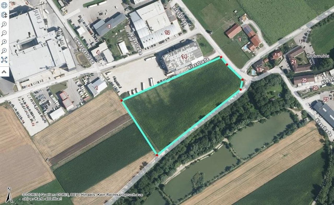 Ein Grundstück mit B-Widmung auf Baurechtsbasis. Die Zufahrt erfolgt über die Kiesstrasse. 85 Cent netto pro Monat und m2 ist der Zins.