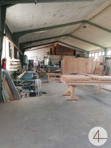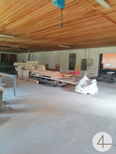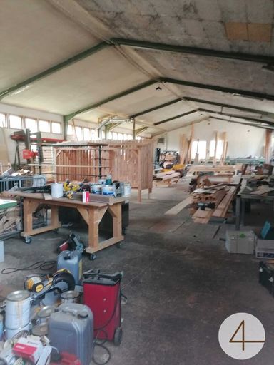Ausgestattet mit einer Absaugung für Holzbearbeitung, einer Stückgutheizung, Kompressor und Werkbank, Montagegrube.