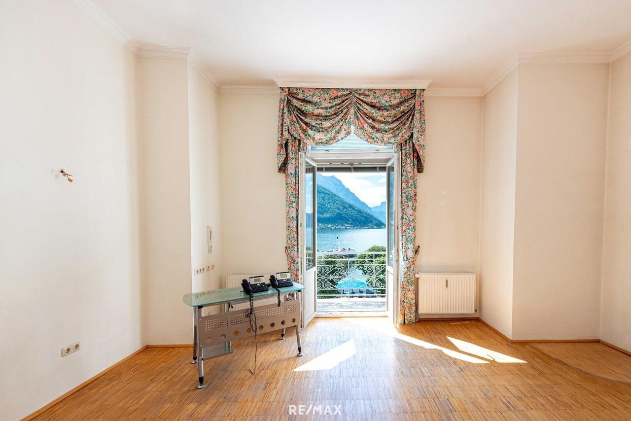 Willkommen in einer außergewöhnlichen Immobilie, die Tradition, Stil und beste Lage auf eindrucksvolle Weise vereint. Im zweiten Obergeschoss des ehemaligen Hotel Austria – einem denkmalgeschützten Gebäude aus dem späten 18. Jahrhundert – befindet sich diese großzügige Ordinationsfläche mit rund 161 m² Nutzfläche und einem atemberaubenden Blick auf den Traunsee und die umliegende Bergwelt.